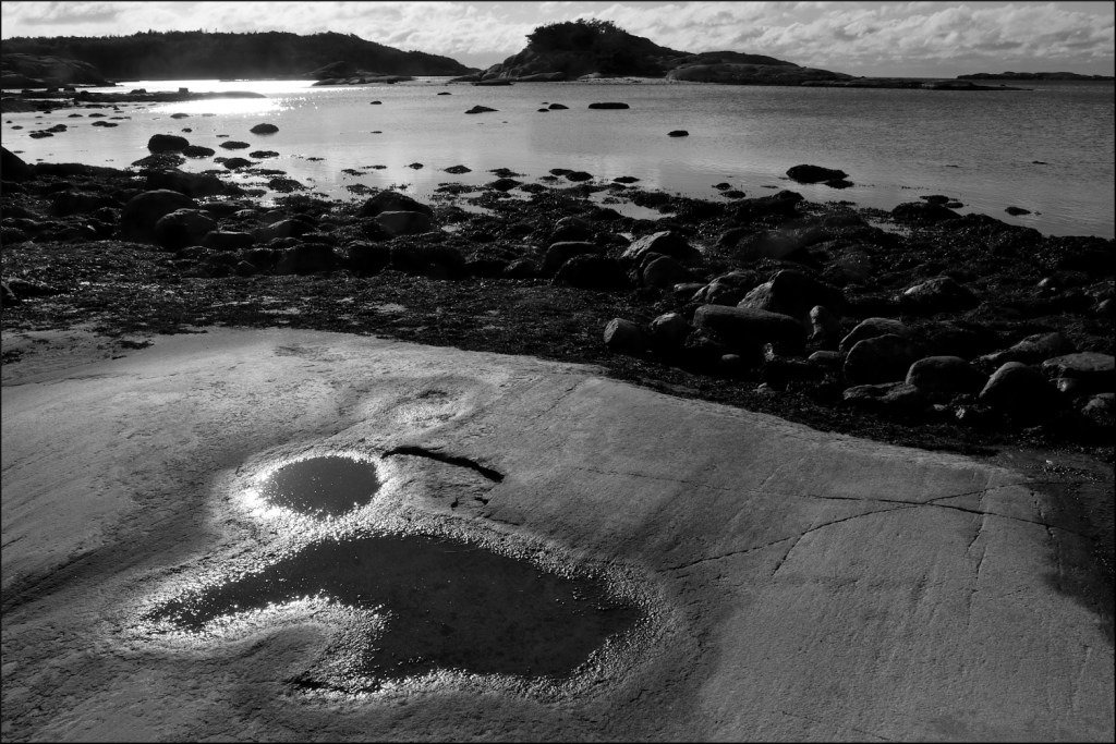 Två meter i skillnad på vattenståndet i havet. Skåne och ostkusten har storm från öster och 1,6 m över normalt vattenstånd medan vi igår, bara 40 mil norrut på västkusten, hade 0,7 m under det normala. Havet böjer sig alltid för vinden, ruskar på sig och sträcker sedan ut sig igen. Flexibelt så det förslår. Strandzonen är helt förändrad, klippor är blottade, sanden på botten synlig och ur havet reser sig öar och mörka tångklädda bumlingar. Havet känns avklätt och naket.