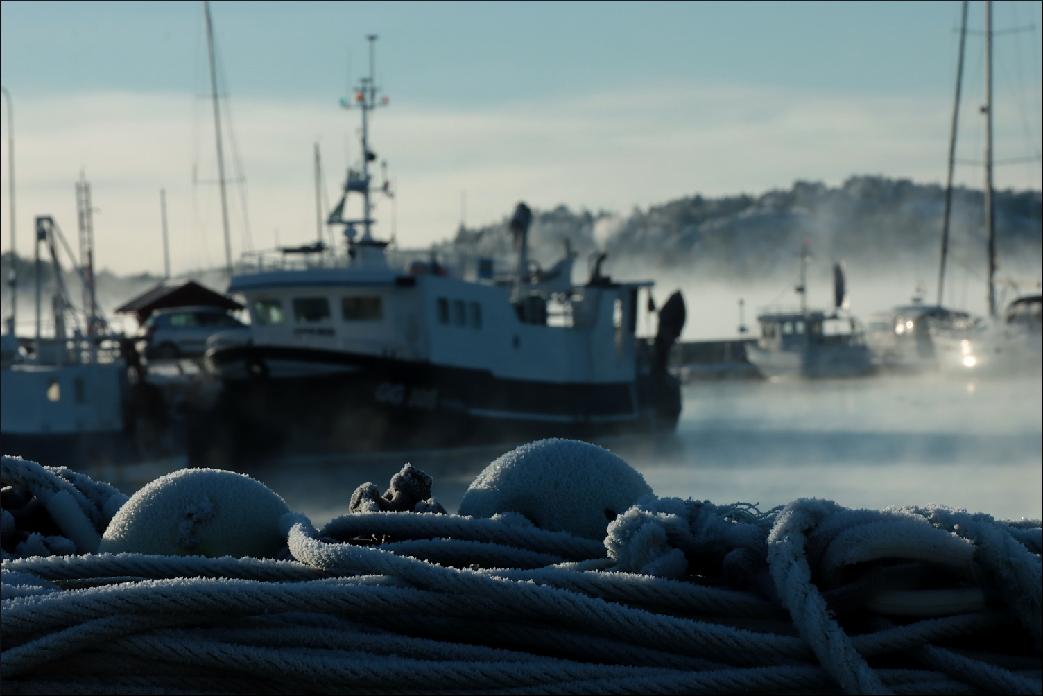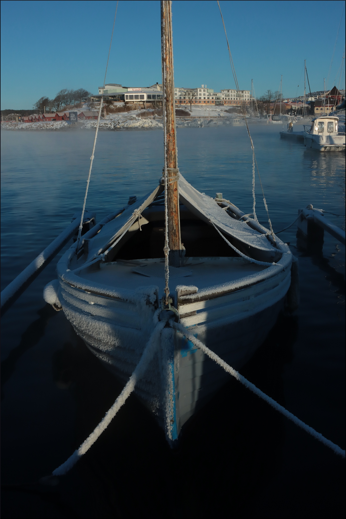 Klart, svag vind, -20 grader Celsius, sjörök och rimfrost.