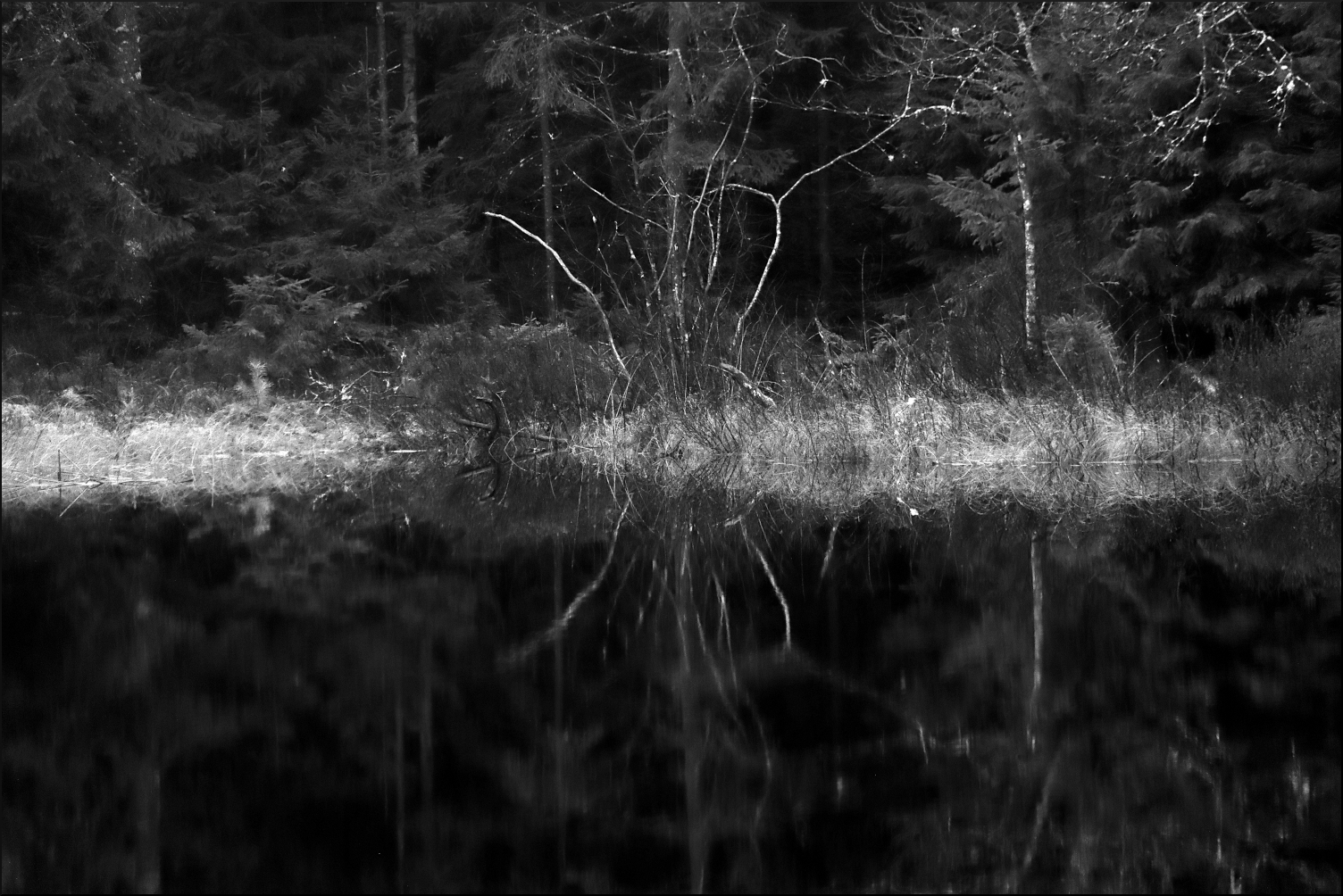 En av många sjöar med norska gränsen som en vattendelare. Utängsmarker där backstugesittare kunde livnära sig på fiske och jakt när skörden på de små åkerlapparna inte räckte till. En gräns som ingen här tänkte på eller brydde sig om, annat än under nazisternas ockupation av Norge under andra världskriget. Då var stigarna och sjöarna livligt frekventerade, flyktingar åt ett håll, vapen och förnödenheter västerut. När det nu bara återstår några åretruntboende tar bäver och vass saktmodigt över omvandlingen.