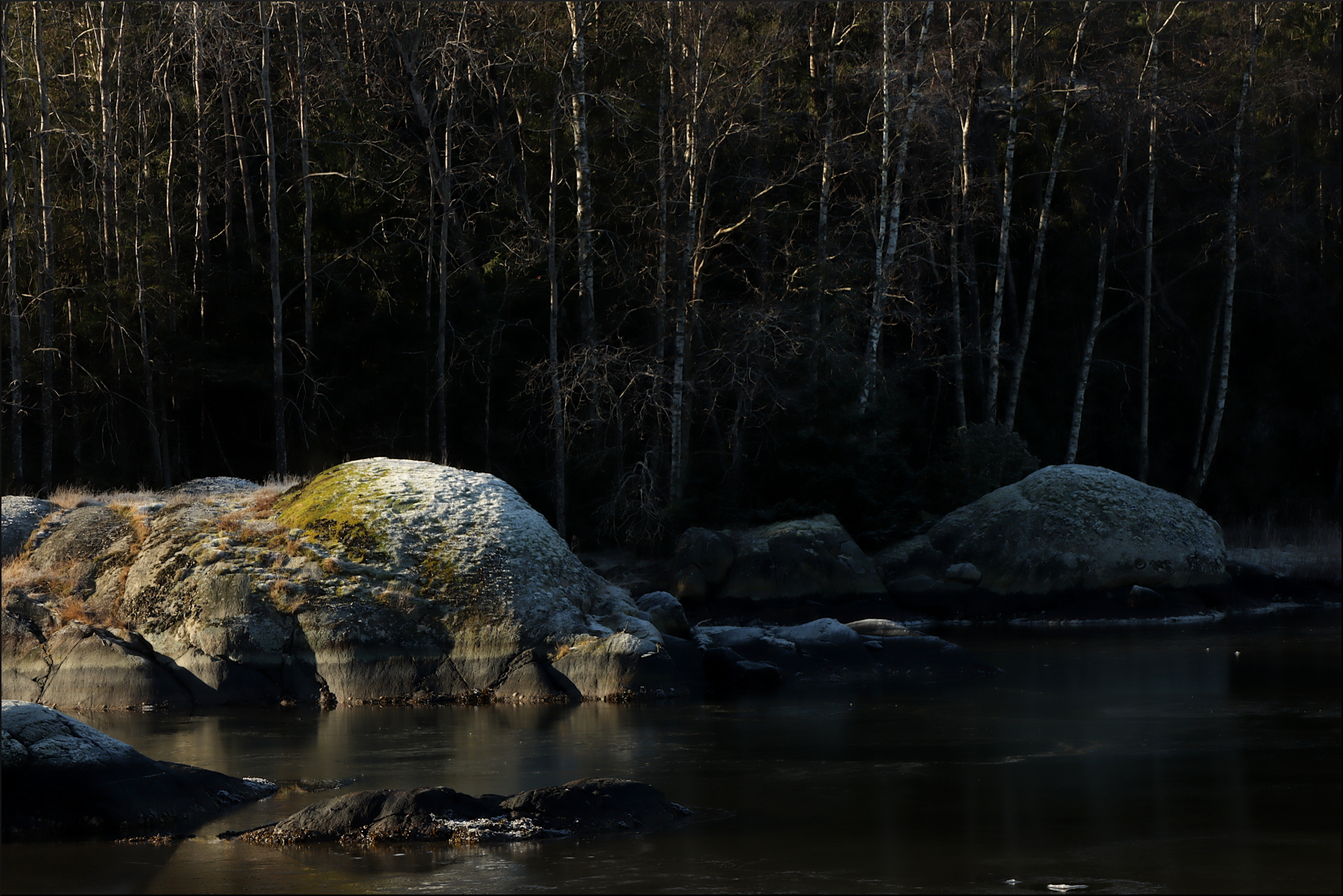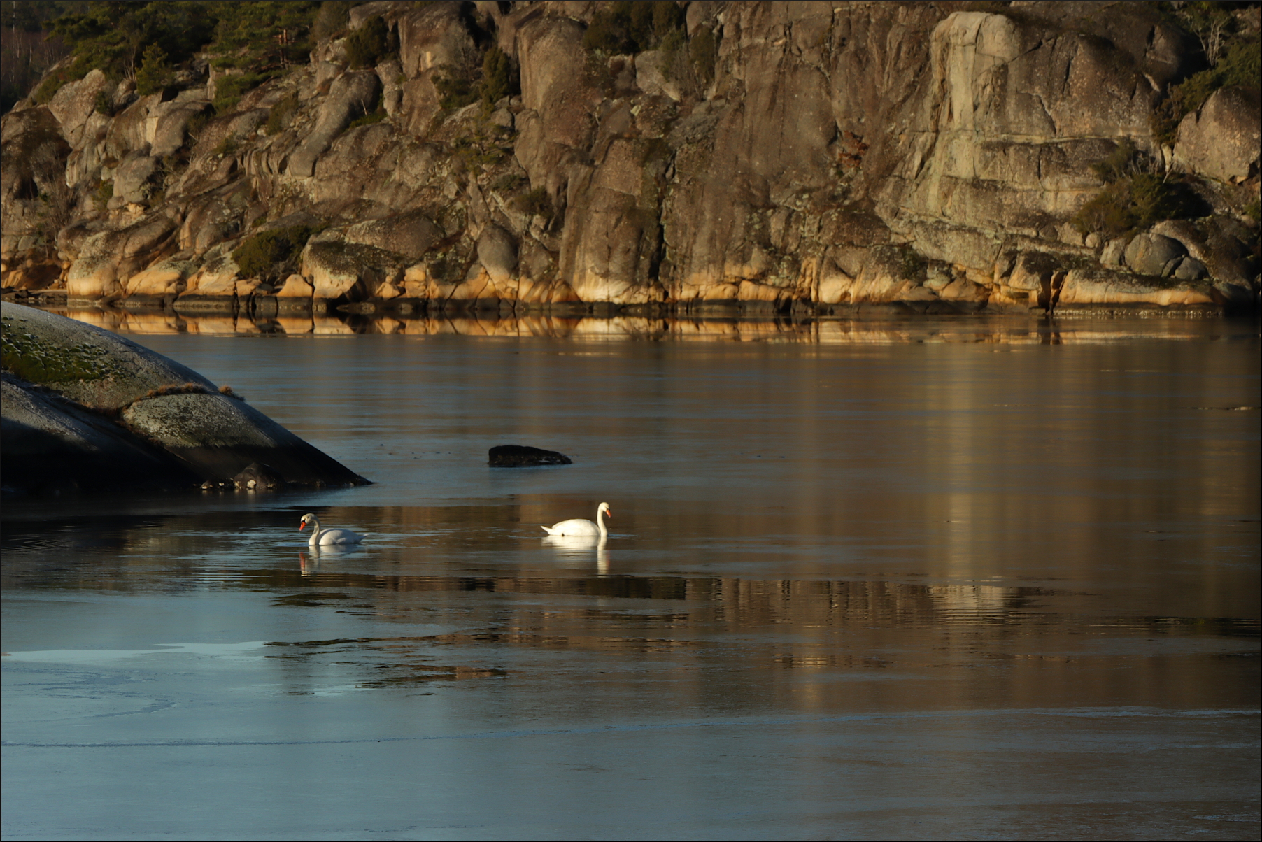 Havsvattnet är nedkylt och trögt. Behövs bara några nattimmar med minusgrader för att spegeln ska frysa till. Den stela hinnan kan ligga kvar över dagen, där februarisolen eller vinden inte når ner bakom berg och skog. Paret knölsvan verkar ändå se med tillförsikt mot morgondagen.