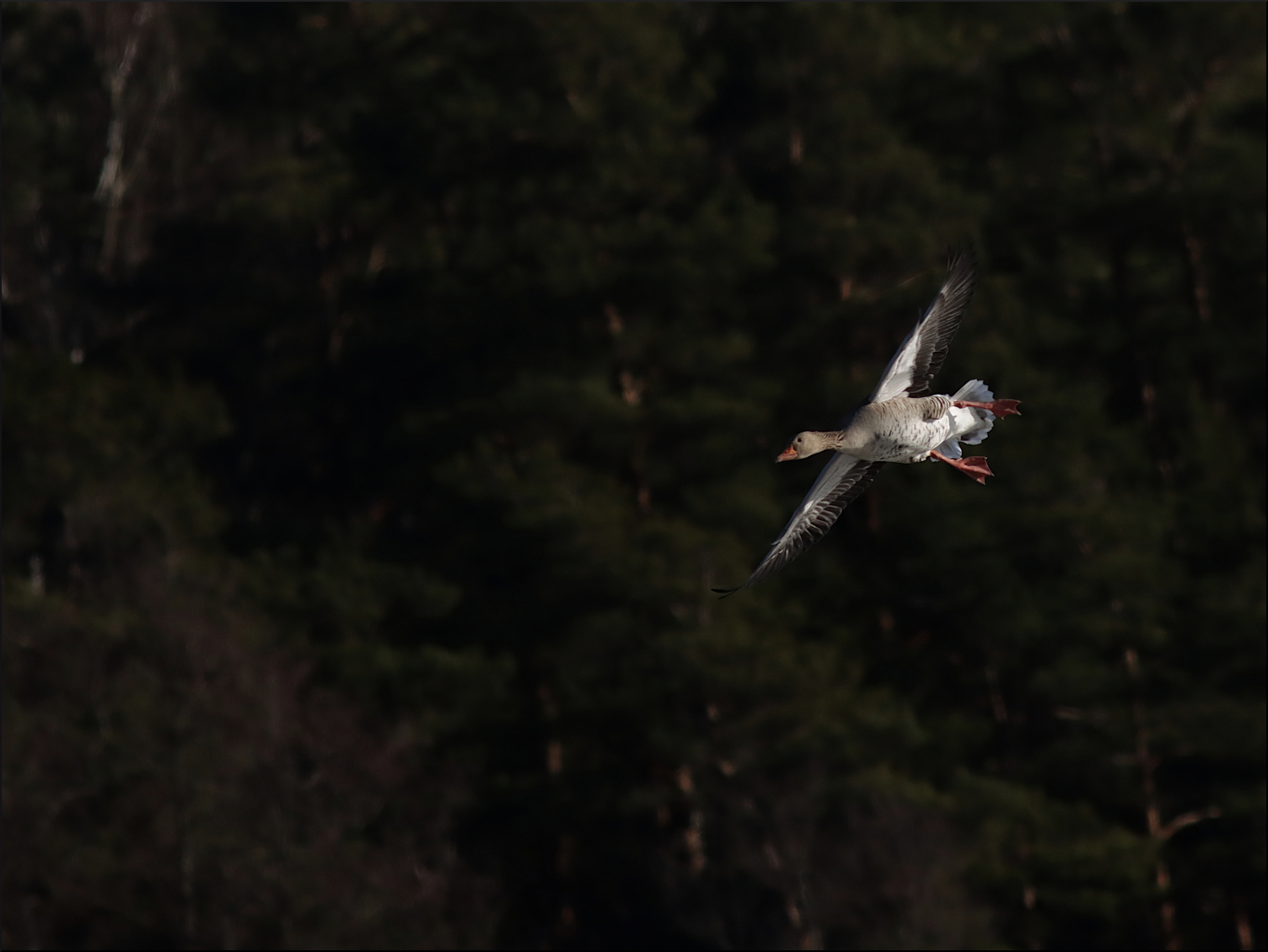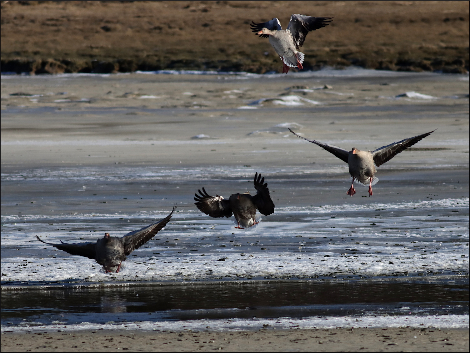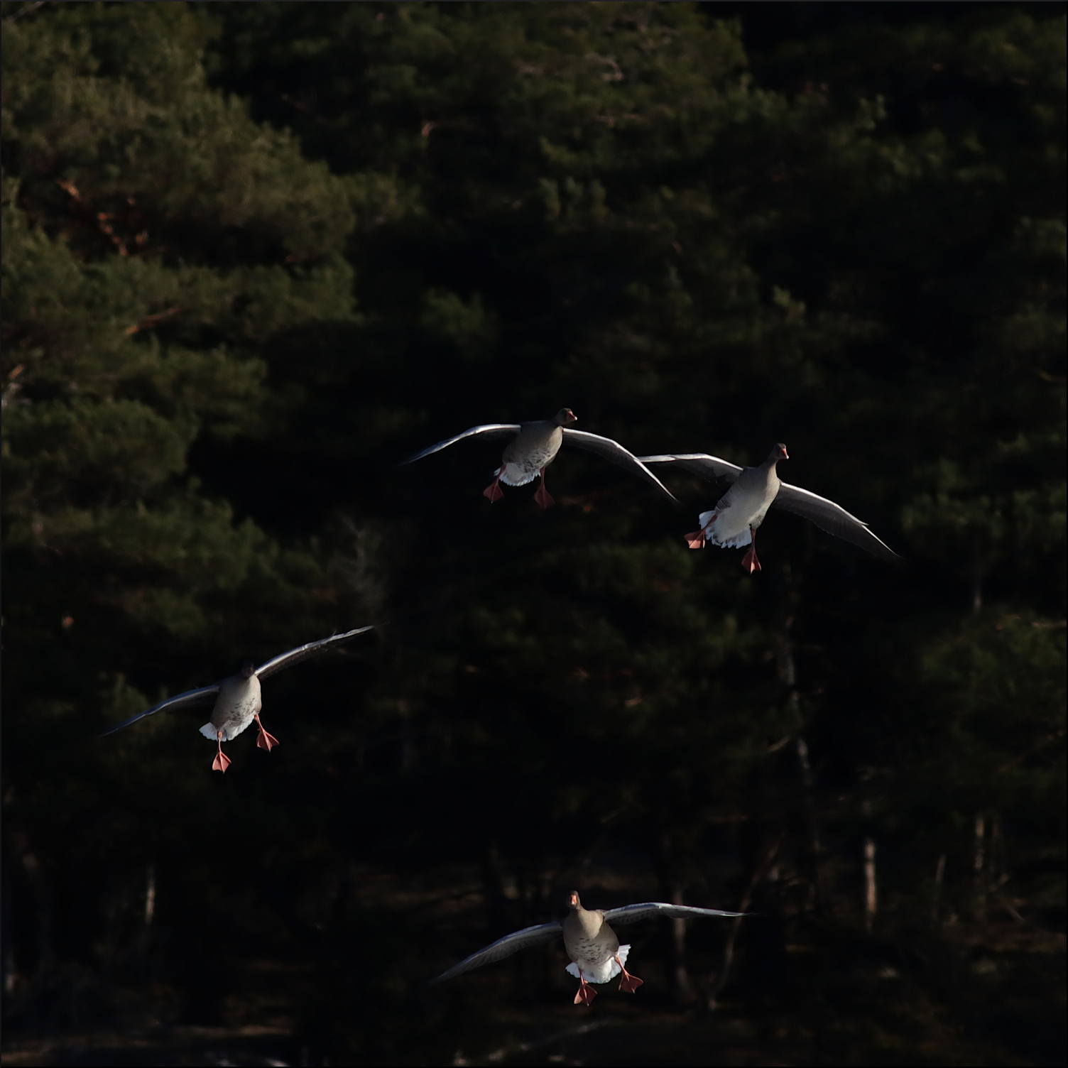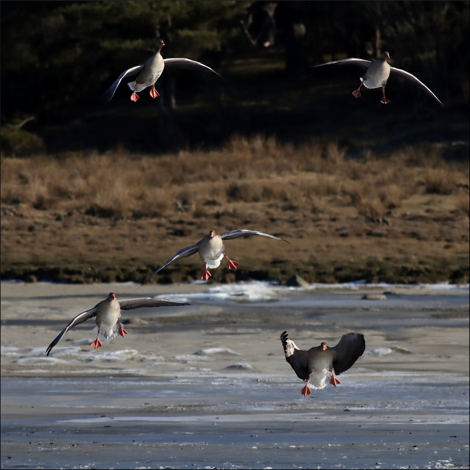 Landningstekniken varierade, men gemensamt för alla var att landningsställena skulle ut tidigt. Ingen vind alls, så de mer eller mindre ramlade ner och motorbromsade med kraftiga vingslag som hördes tvärs över viken. Huvudsakligen var det grågäss, men ett par mindre med vit bläs i pannan och mörka större band på bröstkorgen smög sig med (se bild 2). Bläsgässens varmt oranga fötter avslöjade dem innan de försvann in i mängden av grågäss.