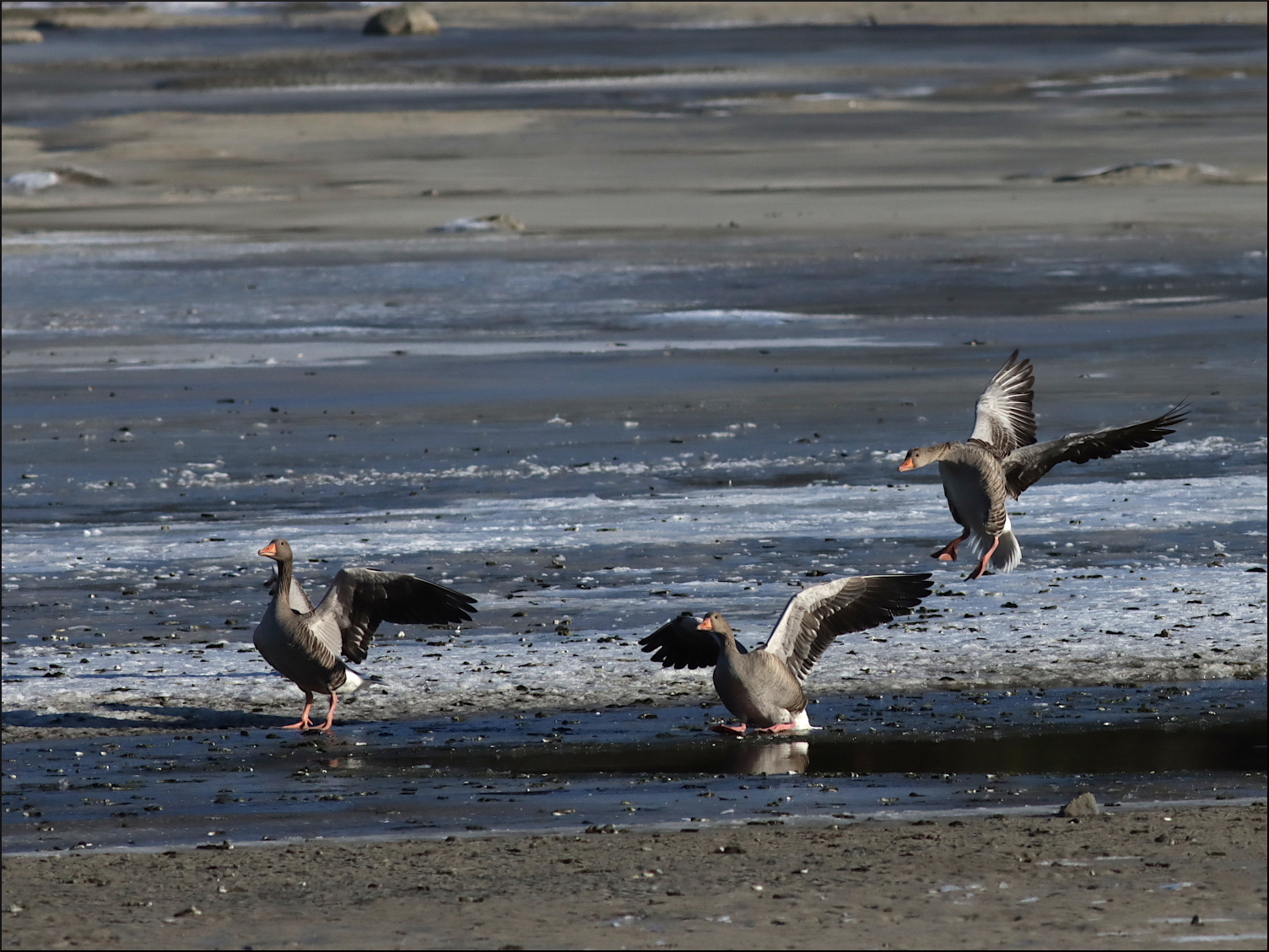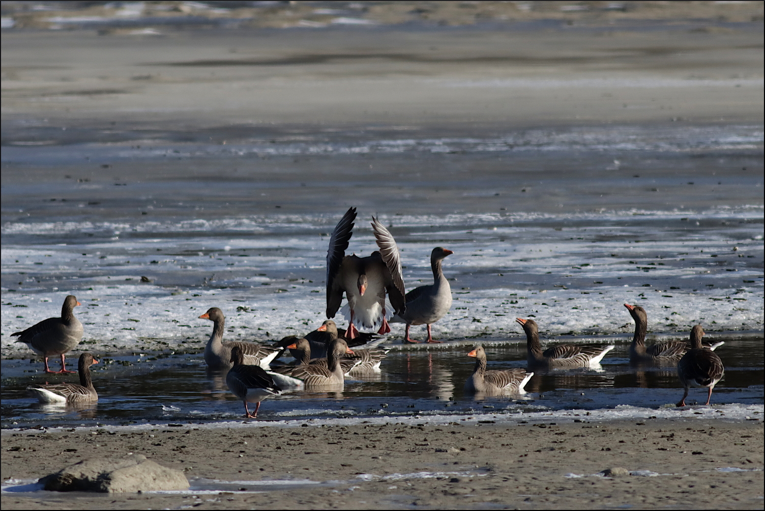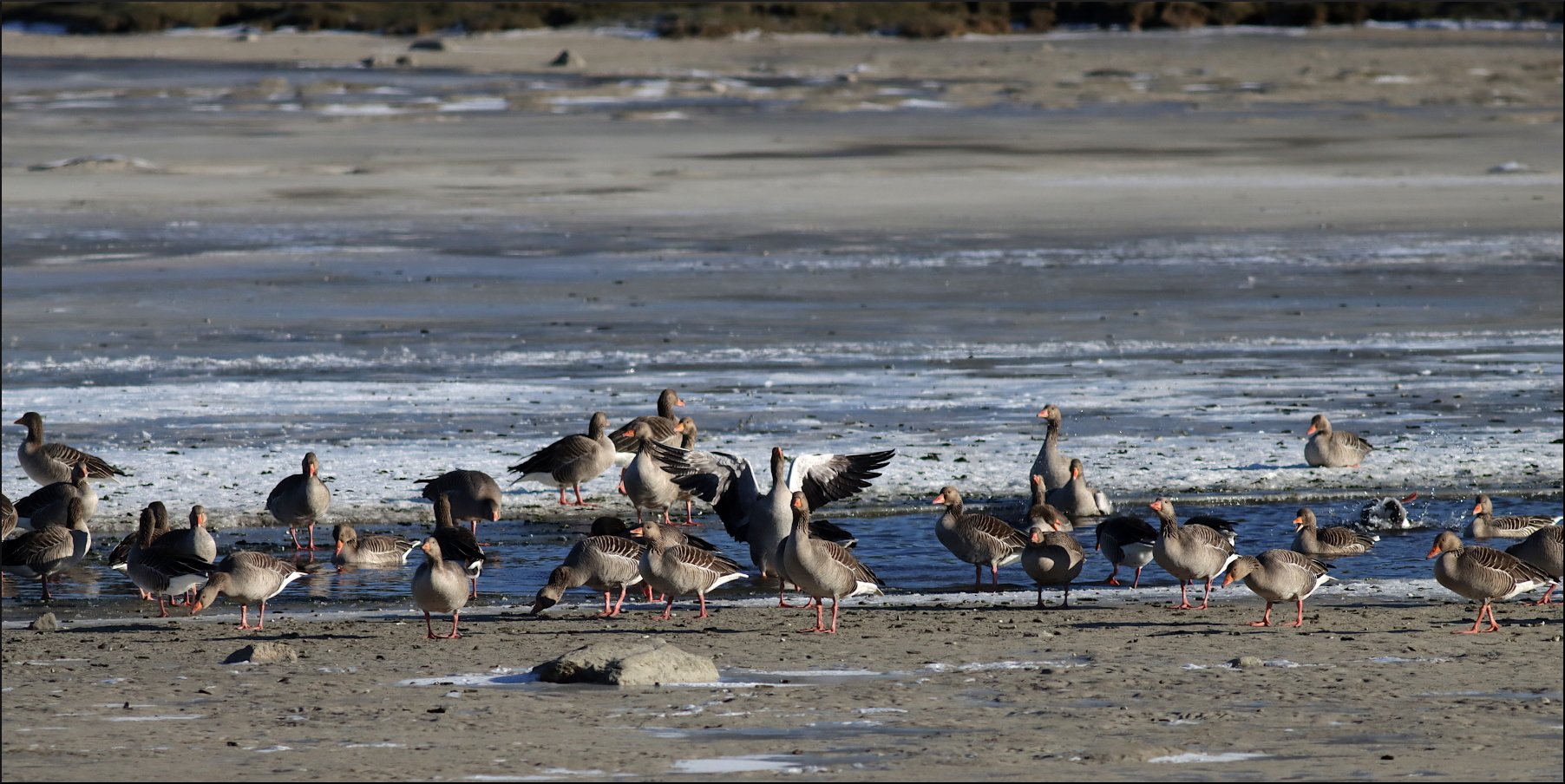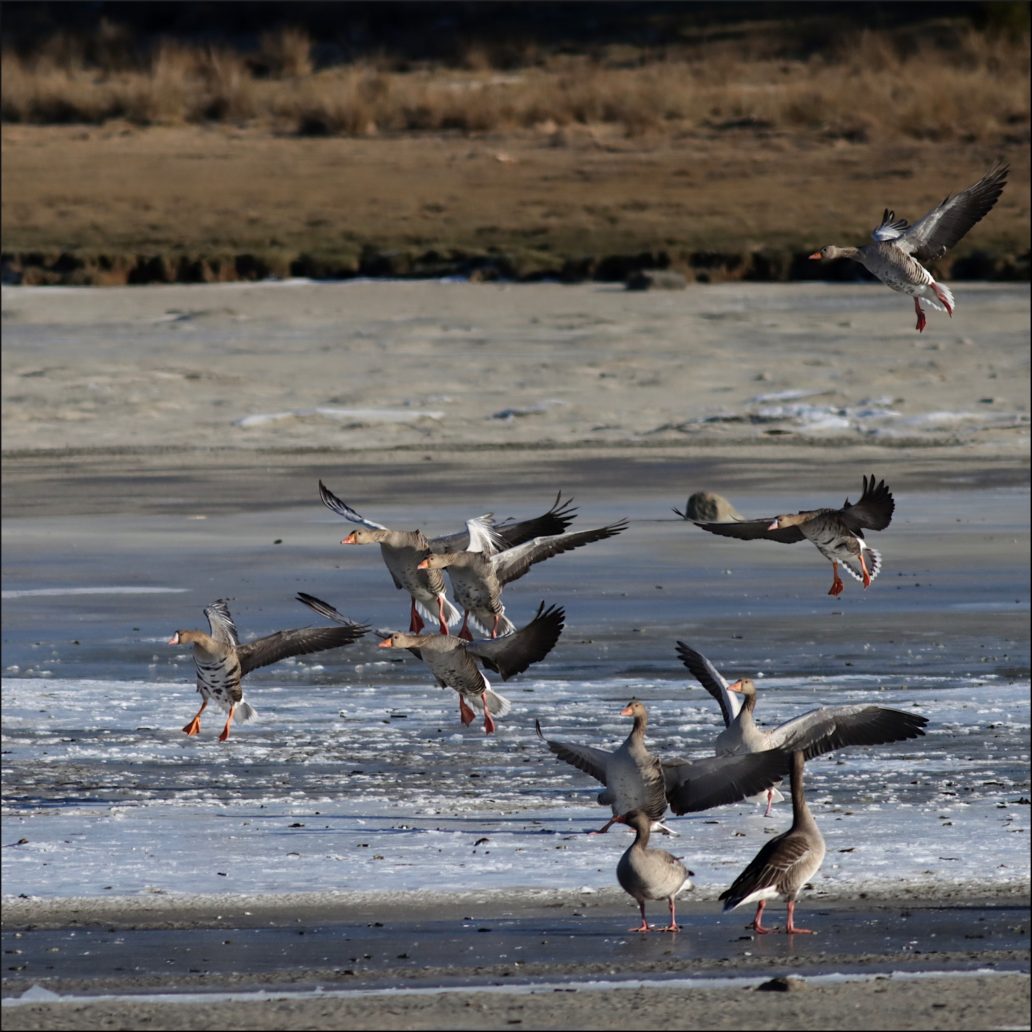 Havsviken var frusen idag, då morgontempen visade -12. Trots att jag smög mig fram, när jag anlände mitt på dagen, lyfte alla gäss från en ökenartad havsbotten, skapad av det låga vattenståndet. Kargt för gässen och kyligt i skuggan av skogen där jag satt. Men det dröjde inte länge förrän grågässen återvände i små grupper tills de var nästan tvåhundra på plats. Något där övervann rädslan.