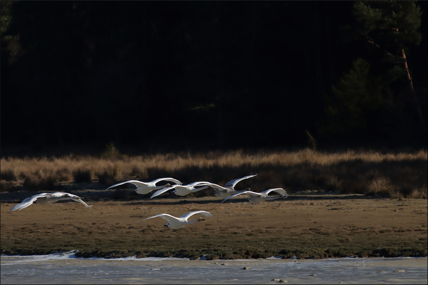 Förklaringen är enkel, men varför gässen lyfte mera oförklarligt. Sju lågflygande sångsvanar hade siktet inställt på samma öppna lilla vattenyta. Borde inte föranleda ett sånt rabalder om det inte hade varit för att en sångsvan bestämde sig för att markera vem som är störst. Landade helt sonika själv mitt bland gässen och skrämde slag på dem. Spatsera sedan stolt med högt huvud till kompisarna. Gölen är vår!