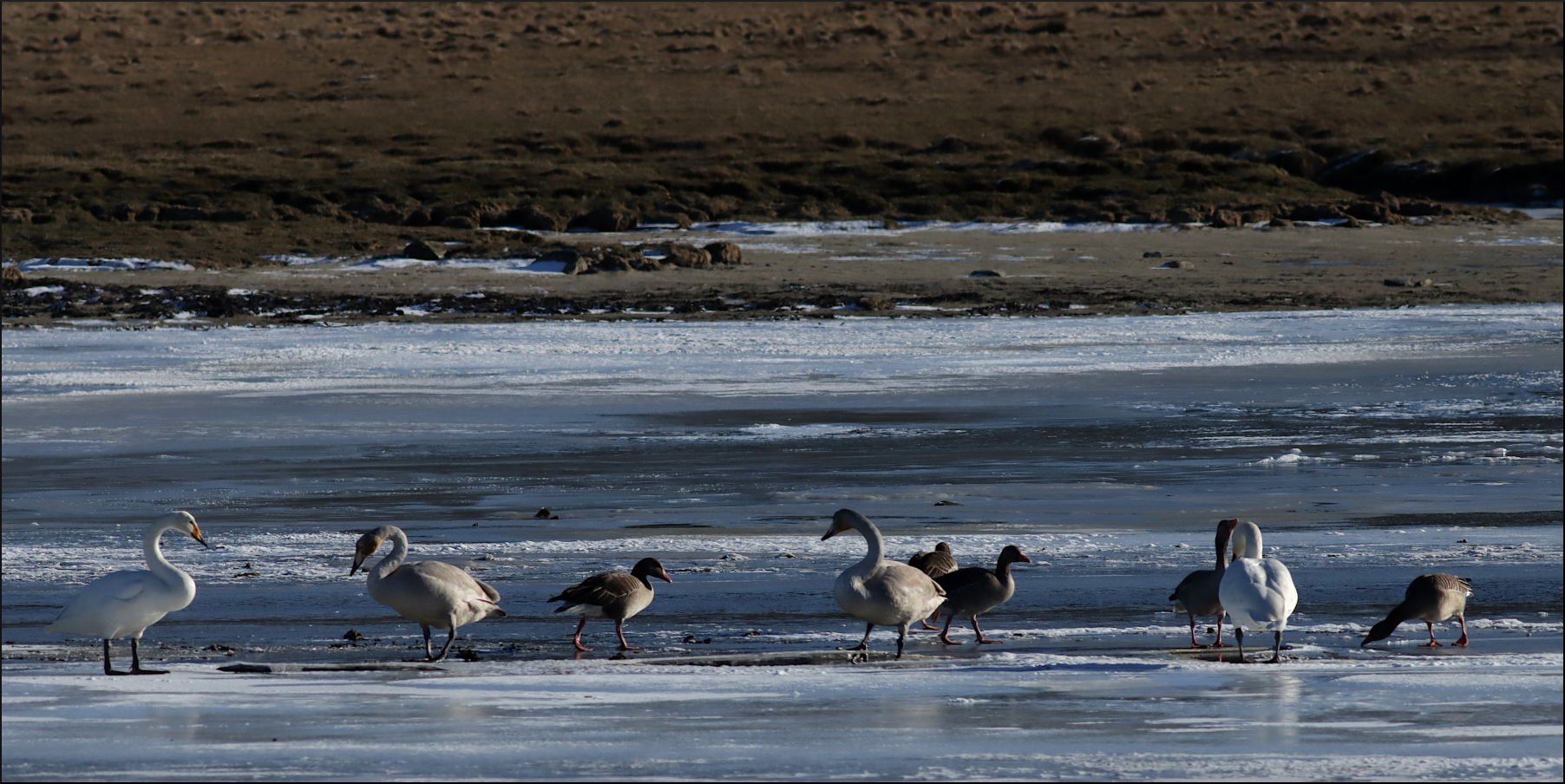 Det dröjer inte länge förrän gässen återvänder. De första landar försiktigt bland svanarna, söker flockens trygghet. Merparten, som anländer därefter, håller sig dock på behörigt avstånd och litar mer till sin egen homogena flock (några bläsgäss får man acceptera). Vem vet, kanske är de lite skärrade fortfarande.