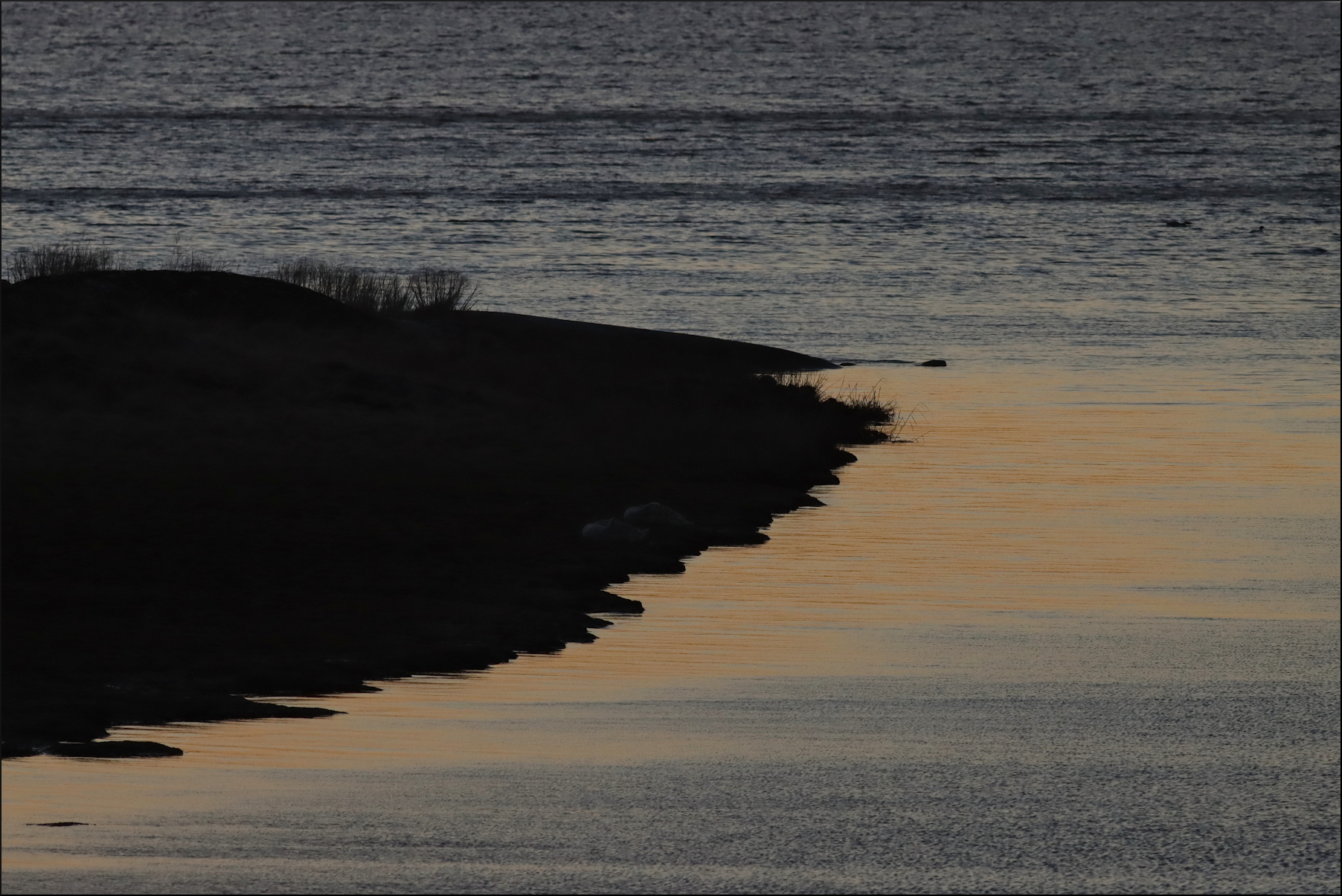 Två unga knölsvanar har valt udden på en låg halvö för natten. Tillfälligt lä mot den kyliga västanvinden men inte tillräckligt tryggt för eventuella nattjägare.