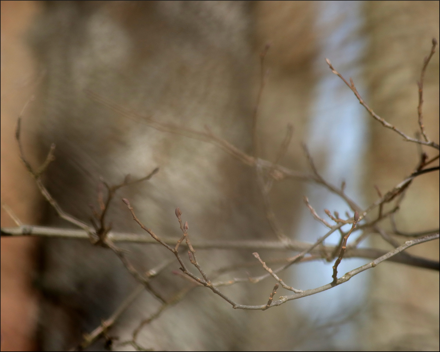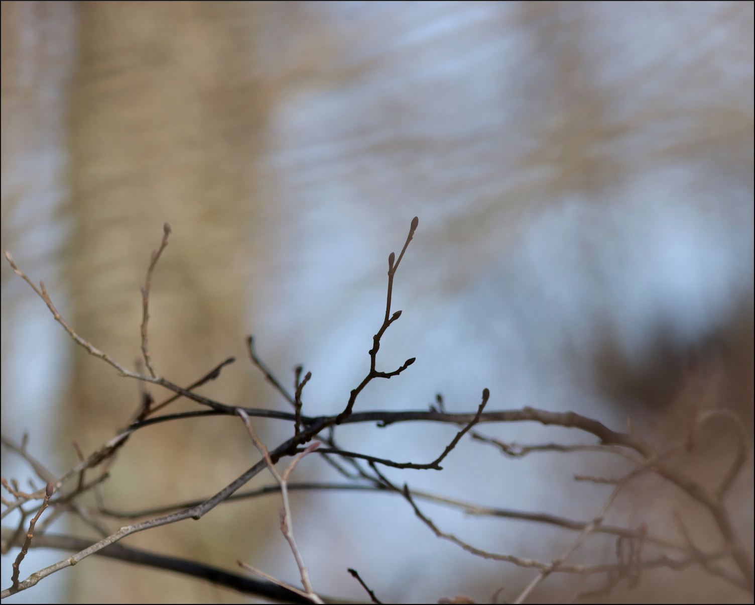Stiltje i viken, men en blåmes och nyfiken svartmes höll till i skogskantens al-snår. De dök upp där jag inte hade tänkt mig eller satte sig på räcket, för nära för teleobjektivets närgräns. Efter några misslyckade fågelbilder ställde jag istället om till att knäppa alarna med telet. Märkliga effekter skapades av oskärpan men knopparna satt i alla fall stilla på grenarna. Får kanske bjuda på lite nötter nästa gång….