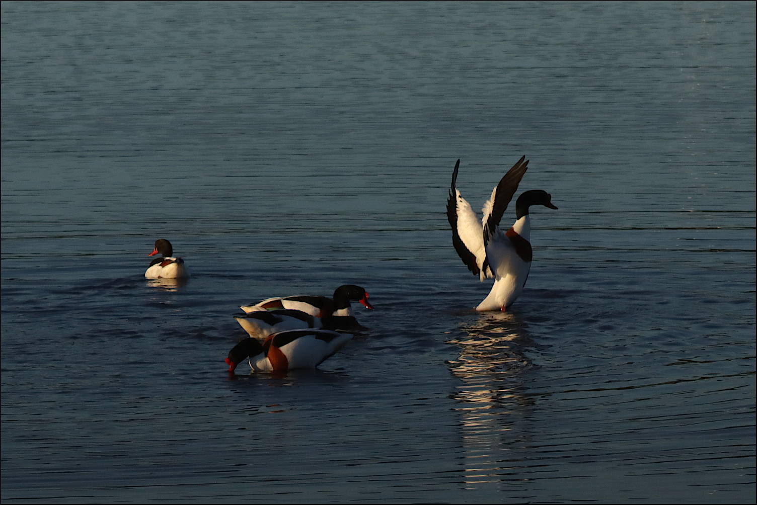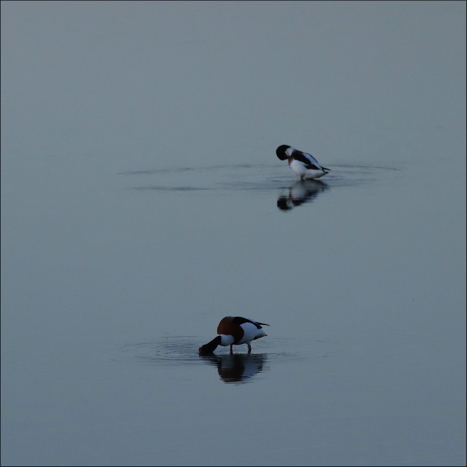 Gravändernas lite stingsliga beteenden har nästan helt klingat av, bara ett par ”ungtuppar” spänner sig. Lite uppvisning i näbbfäktning med sträckta halsar och några spänstiga vingslag kanske imponerar på damerna runt omkring. Men snart avslutas kvällen som vanligt, lite snacks till kvällsmål och putsning så allt ligger på plats inför nattens vila.