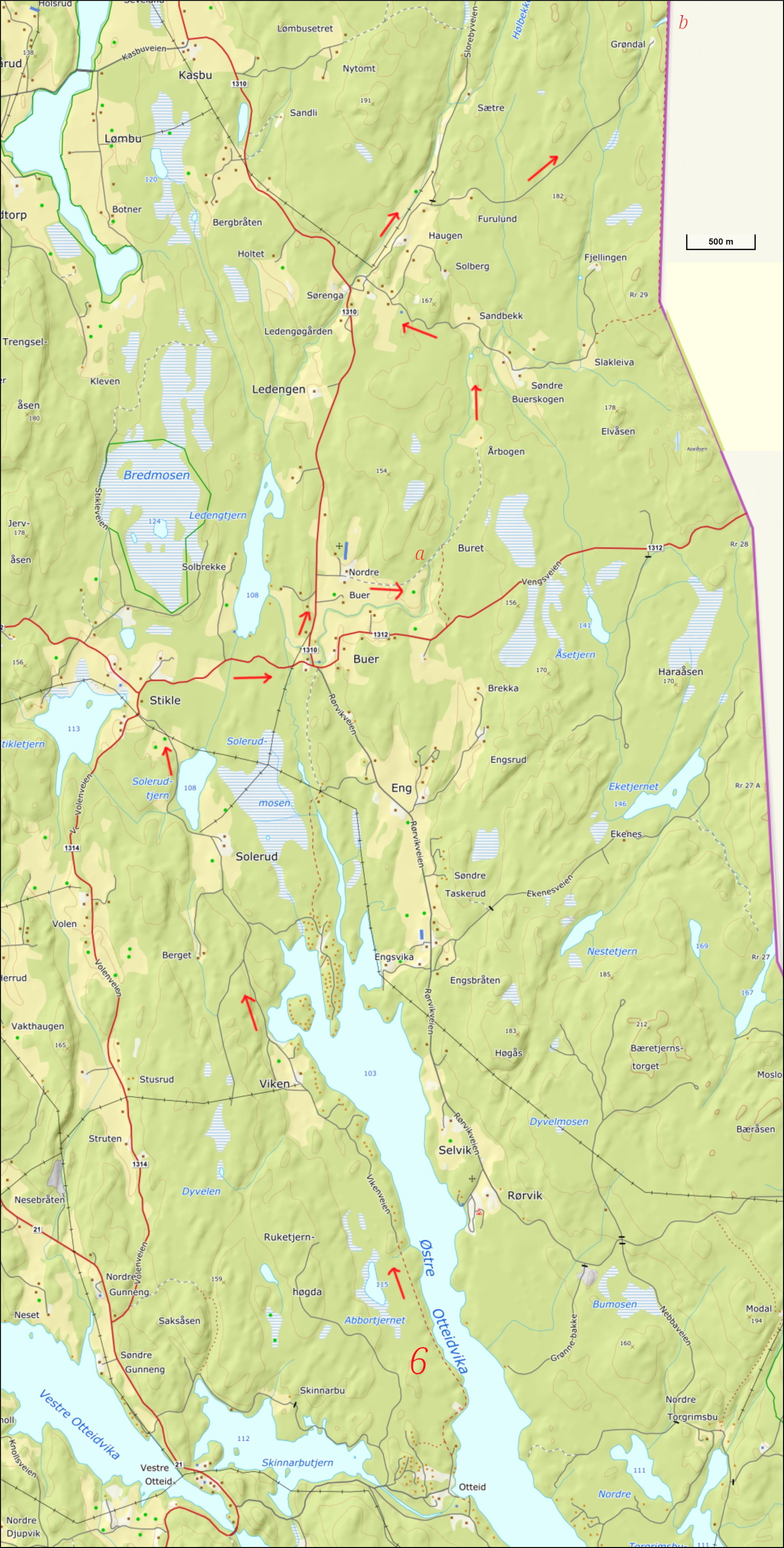 ”Den halvdåliga blåmarkerade stigen ledde oss vidare norrut, en bit i alla fall. Höll kontakten med sjön och hamnade på den sista hyttans gräsmatta. Följde den bommade hyttevägen, inte ett liv. Uteplatser, grillar och partytält stod och väntade på värme och semesterfirare. Passera gården Viken. Illa skötta marker med ett mindre sopberg på en ö mitt i en åker som såg nybruten ut med stora grästorver överallt, högar av plastdunkar och gamla rostiga maskiner på rad som en slags ”landart”. Nästa gård Solerud var raka motsatsen, fint harvade och sådda marker med decimeterhöga årsskott.”