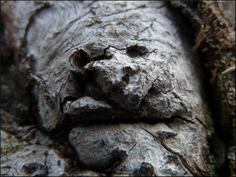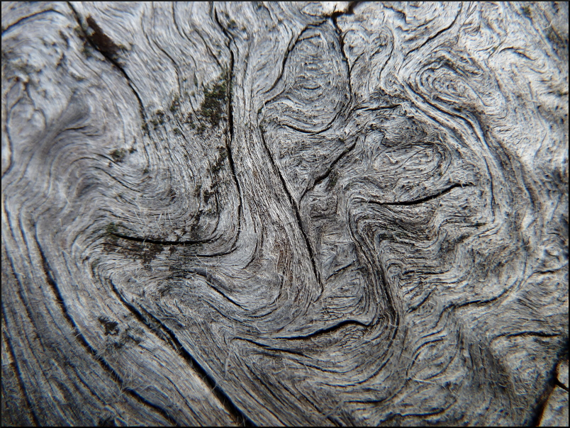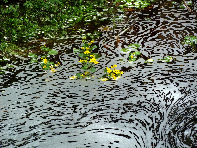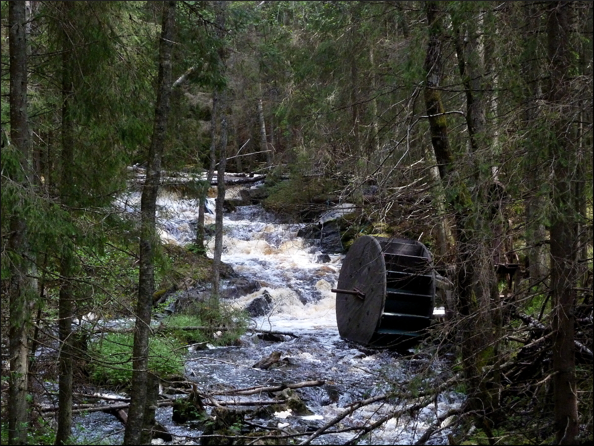 ”Vägen var bitvis svårfunnen, men även här fanns blå prickar på träden ibland. Där stigen passerade en strid bäck låg ett kvarnhjul i bäcken, med en fantastisk konstruktion av hjul, remmar, växlar och cykelhjul med mera (a).”