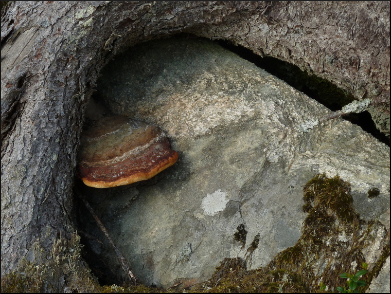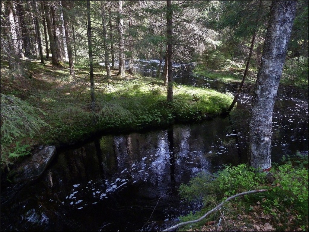 ”Leden, som var blå och orange markerad, startade på ett hygge och följde gränsen och de gula riksrösena slaviskt. Jag gjorde en och annan avvikelse in i den oröjda skogen, bl.a. vid Baggetjärnen, där det häckade ett tranpar. Vi fick med andra ord knata på. Tyvärr dåligt med vattendrag. Det som fanns var myrtjärnar och småbäckar från myrar med vatten som luktade sumpgas.”
