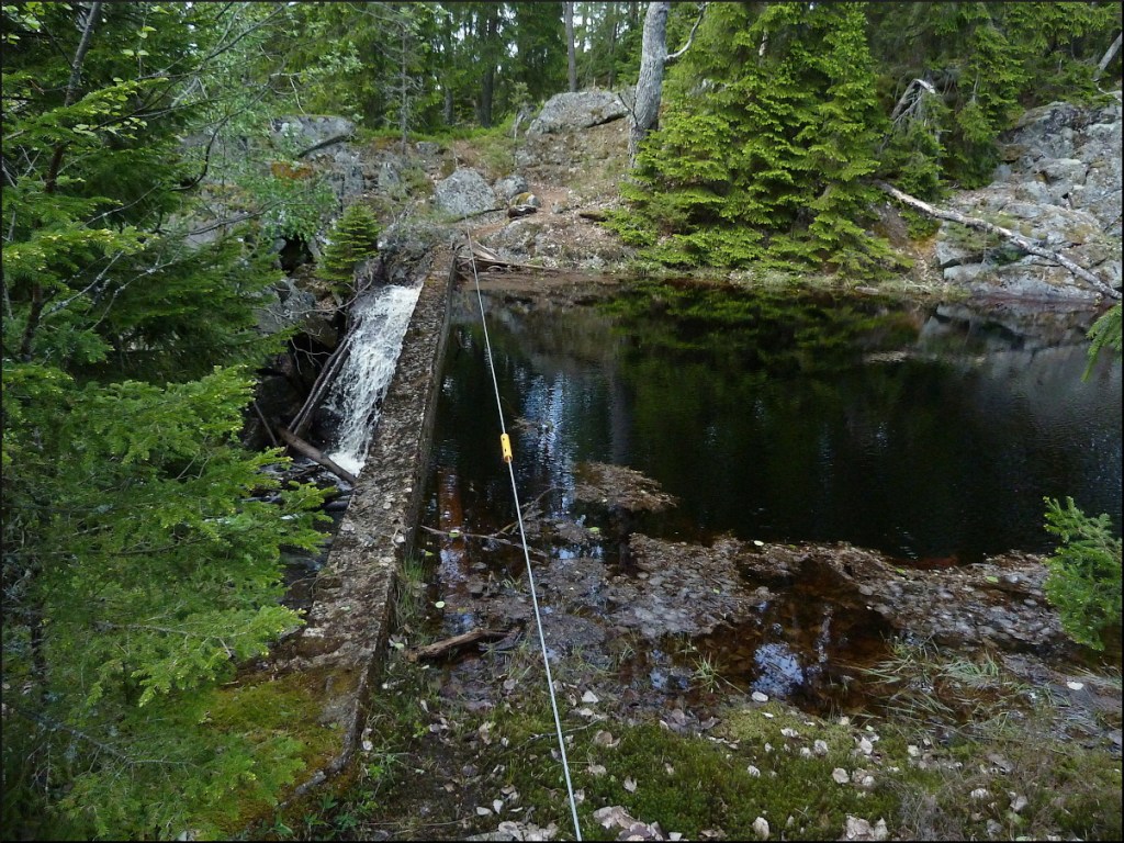 ”Leden, eller stigen snarare, var förhållandevis sliten och välgången för att vara så pass ny. Satsa på att tälta vid den första tjärnen. Men första hindret var den smala dammen på 30 cm och en vajer att hålla sig i (b). Bäcken var nämligen uppdämd 5 m, med gamla järnrör uppstickande från dess botten. Gick bra trots att Acke tryckte på bakifrån och tyckte det gick långsamt!”