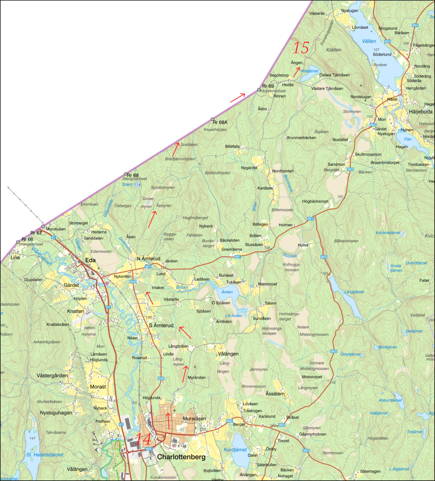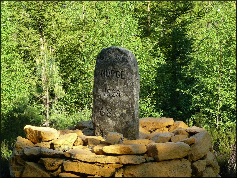 ”Stigningen upp i Svandalen blev het och förstadagsjobbig. Knäa flera gånger innan vi kunde vila och dricka på gränskammen. Blå-orange markering på Finnskogsleden bort mot riksröse 68A, därefter blå i Sverige och orange i Norge.”