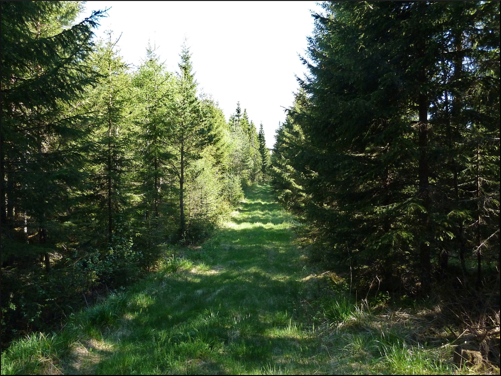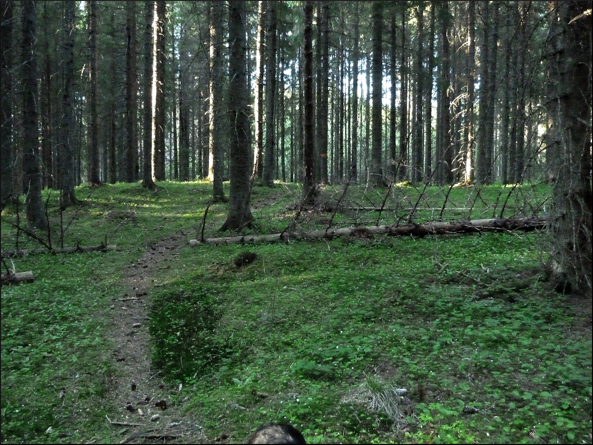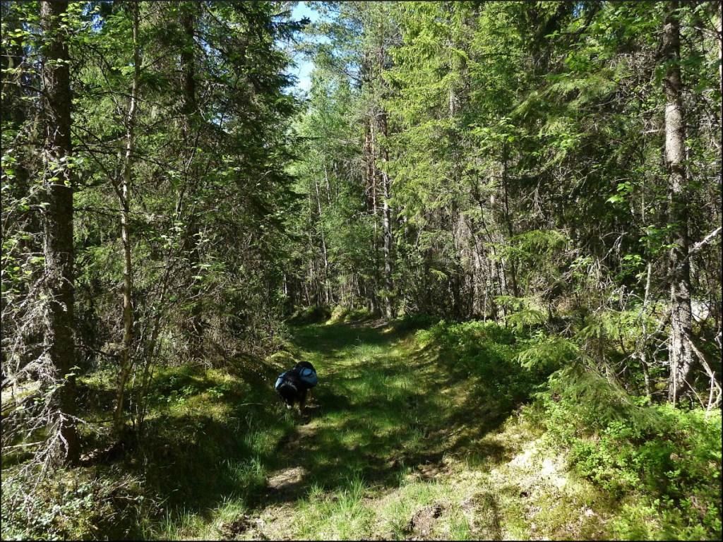 ”På svenska sidan gick stigen genom mytisk granskog i kvällsljus med svärmande insekter. Fin stig ner till vägen, mot Klättjärnet. Kollade tältmöjligheter vid sjöns syd, väst och norrsida (i öster stugor). Tyvärr alldeles för sumpigt och risig skog.”