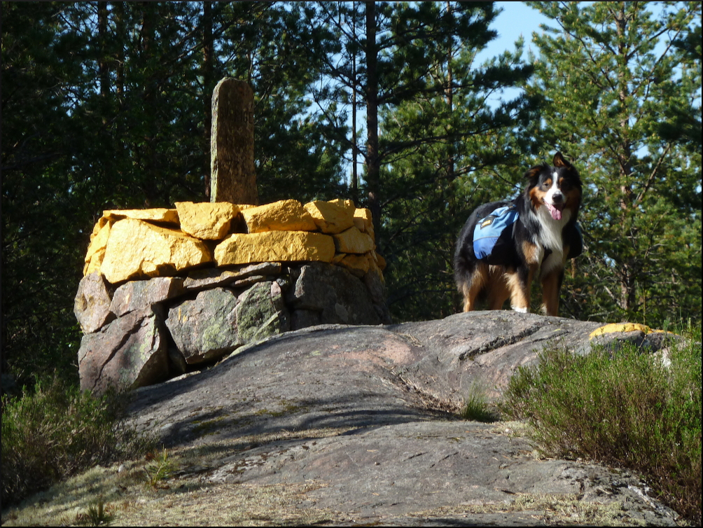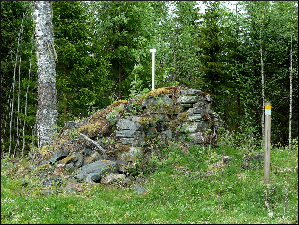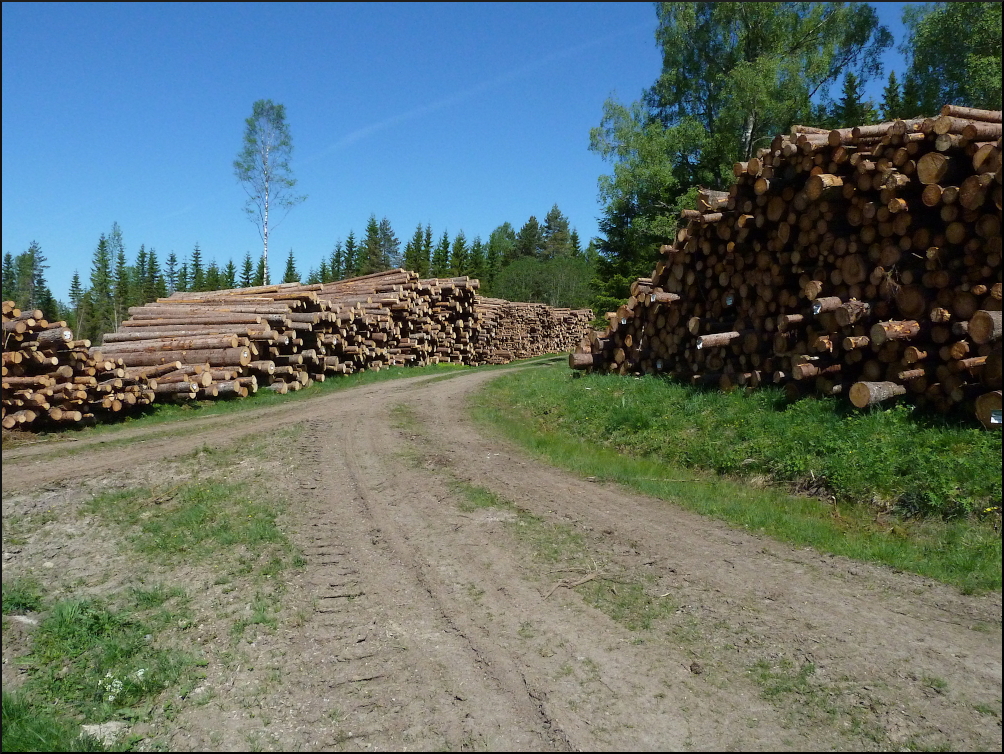 ”Vid gränsbommen till Norge gick leden vidare utför, tvåfilig äldre skogsväg. Mycket trötta tankade vi vatten för lunch på norska sidan, precis innan vi korsade nästa gräsbevuxna skogsväg. Passerade nästan Lystjärnsröset och fortsatte längs gränsen till ännu ett grillhygge. Där tog bensin slut för min del och en skuggad gles tallskog fick bli räddningen på hygget.”