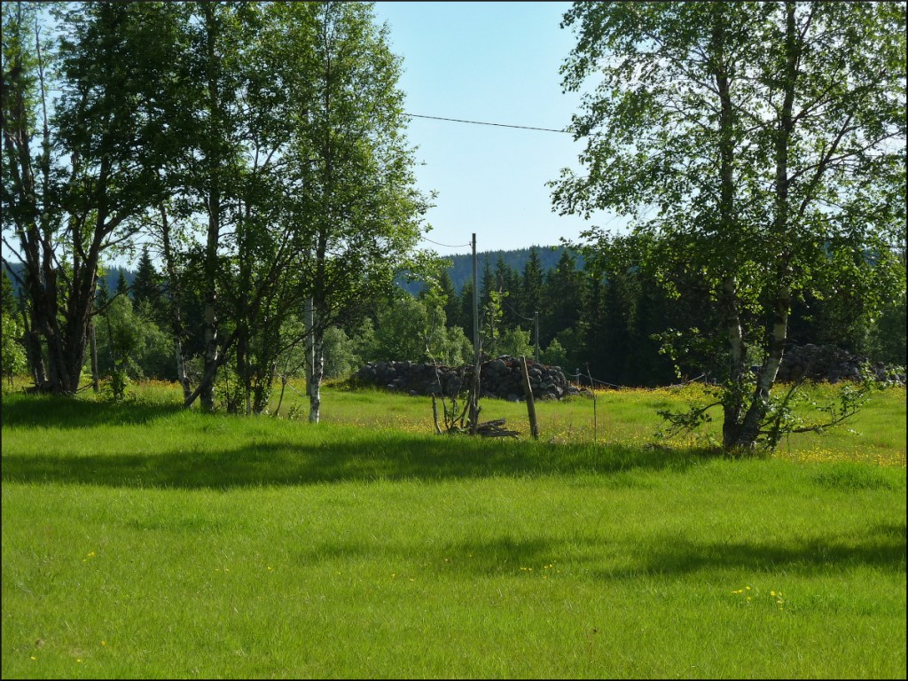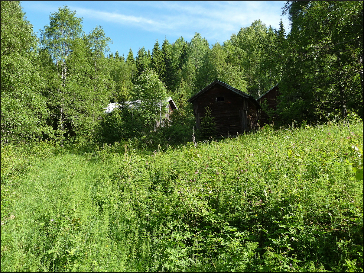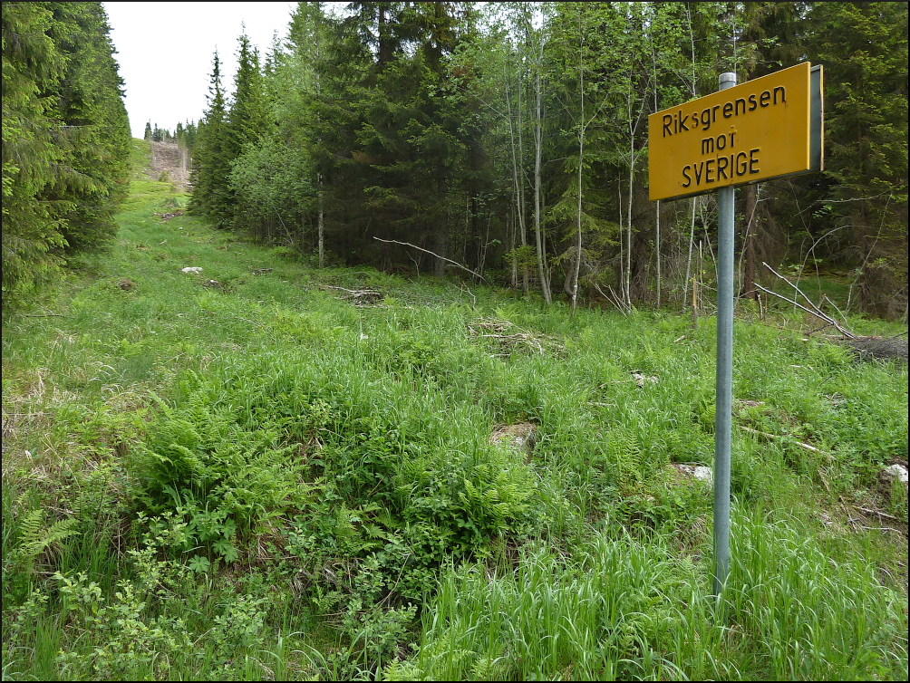 ”Låg en del bebodda hus mot den gamla tullstationen, ömsom svensk och norsk flagg. Skolan syntes vara sommarställe men gränsaffären var tom och öde. Mötte två värmlandsgubbar i shorts längs den varma vägen. De förutspådde regn över Dalarna till kvällen. Prognosen kanske stämde, med tanke på de små fjädermolnen jag såg i morse vid tjärnen.”