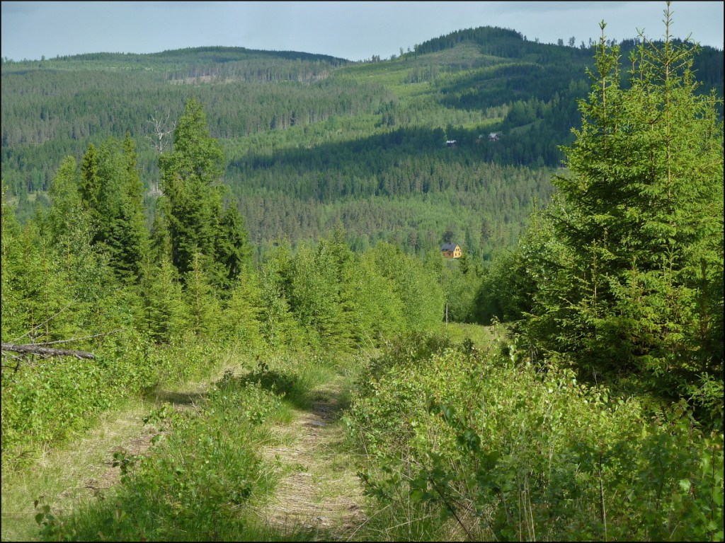 ”Turen dit gick rätt så snabbt. Först 1,5 km längs skogsvägen, in på en gammal skogsväg med bom, över en bäck i ett skutt och vips på nästa ännu äldre, men fina skogsväg. Dags att leta efter leden, trots att ledkartan inte ofta stämde. Leden fortsatte över öppna ytor, mest gamla hyggen, där tyvärr ljung, ris och gräs till och med fick Acke att tveka om det var rätt väg. Gamla käppar fanns dock här och där.”