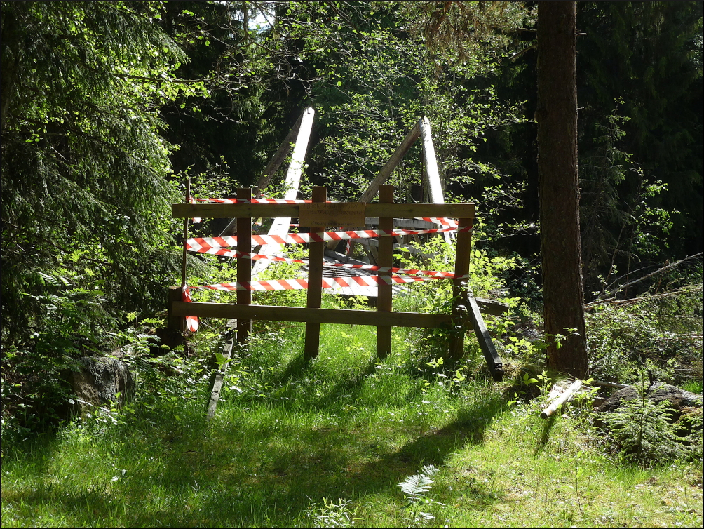 ”Himlen svartna plötsligt och vi hann precis läsa att bron var avstängd innan vi rusade ner till älven. En ispropp i vintras hade nästan tagit hela bron. Södra delen var borta, kvar på stenpelaren låg en sned balkkonstruerad träbro försedd med spärrband.”
