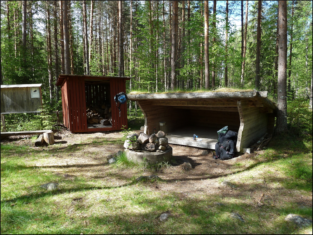 ”Bet i gruset för stigningen upp över berget Noppi. Drygt halvvägs visa en enkel käpp med orange färg att här tar leden vid. Leden gick mycket över gamla hyggen, så käpparna var enda vägvisningen. Reste upp de som låg ner längs med ”leden”. Fortsatte vägen nerför berget till ett fint vindskydd på toppen av ett äldre hygge, lagom till nästa stilla regnskur. Tog en lunch och skrev lite i väntan på lite bättre väder.”