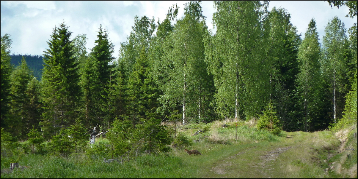 ”Leden gick vägen upp mot Nordgården och vek av strax innan husen rakt upp mot Kanasberget. Färska färgmarkeringar men i stort sett inte ens en stig. Leden föll sedan brant ner och korsade en nyare skogsväg vid Tillgosholen. På håll såg jag en räv sitta vid vägen, med hygge på ömse sidor. Vi hade precis tagit skydd under en gran undan dagens kraftigaste solskensskur. Vi hade vinden mot oss, så den lät sig fotograferas ett par gånger på långt håll. Satte staven för häftigt i gruskanten, då lyfte den svansen högt och flög iväg över hygget. Acke hann aldrig fatta vad som skett, men dofterna var färska meddela han senare!”