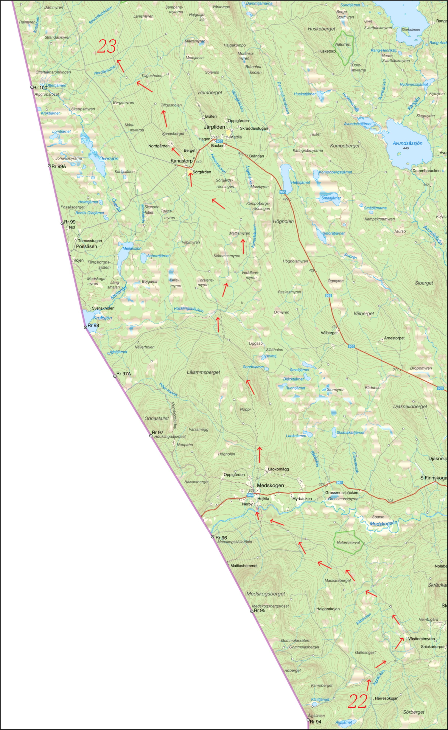 ”Kom ner en kort bit på den nya skogsvägen. Genade in på leden igen över till en äldre skogsväg. Onödigt kanske, mest surt med vit- och björnmossa. Flera nya skogsvägar här korsade varandra, så kompassen fick vägleda ner mot bron och rastplatsen på norra sidan av Medskogsån.”
