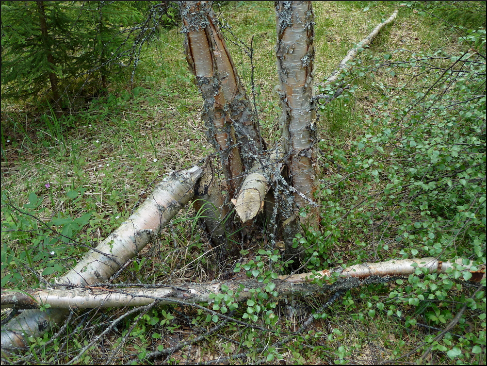 ”Däremot hade en bäver sin hydda nedströms bron och gjorde sitt eget dammbygge med åtskilliga fällda björkar runt omkring. Tog lite fika och gjorde några kast på ömse sidor om bron. Fina höljor men bara en blåsvart abborre tog draget och släppte på land. Väldigt mörkt vatten och botten, inga vak.”