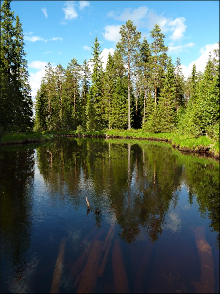 ”Ägnade istället kvällen åt lite kroppshygien, när nu rinnande vatten fanns. Acke hoppade i efter en pinne som sjönk, letade så att han också fick sig en rengöring. Njöt vid ån och skrev av mig dagen, tills solen skuggades bakom höga granar. Tog en brakmiddag på pulvermos och stekt lufttorkad skinka, som ersättning för färsk öring. Diska i ån, en kaffe med choklad fick runda av innan vi koja alldeles för tidigt, men trötta så det räckte.”
