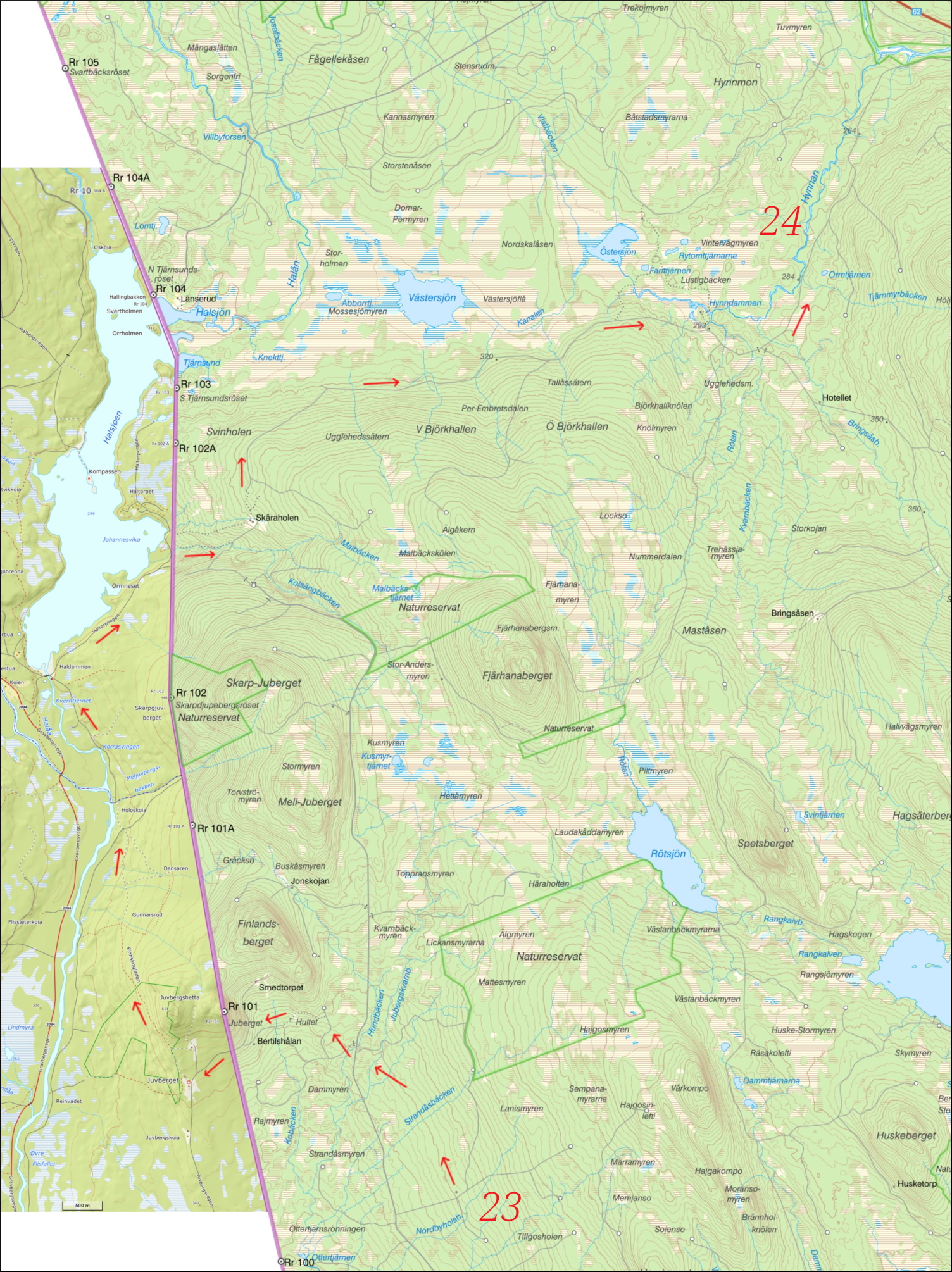 ”Leden fortsatte mot vägkorsningen vid Hundbäcken. Samma skick som gårdagen, men något bättre mot slutet där torra tallhedar inte växte igen som de blötare markerna.”
