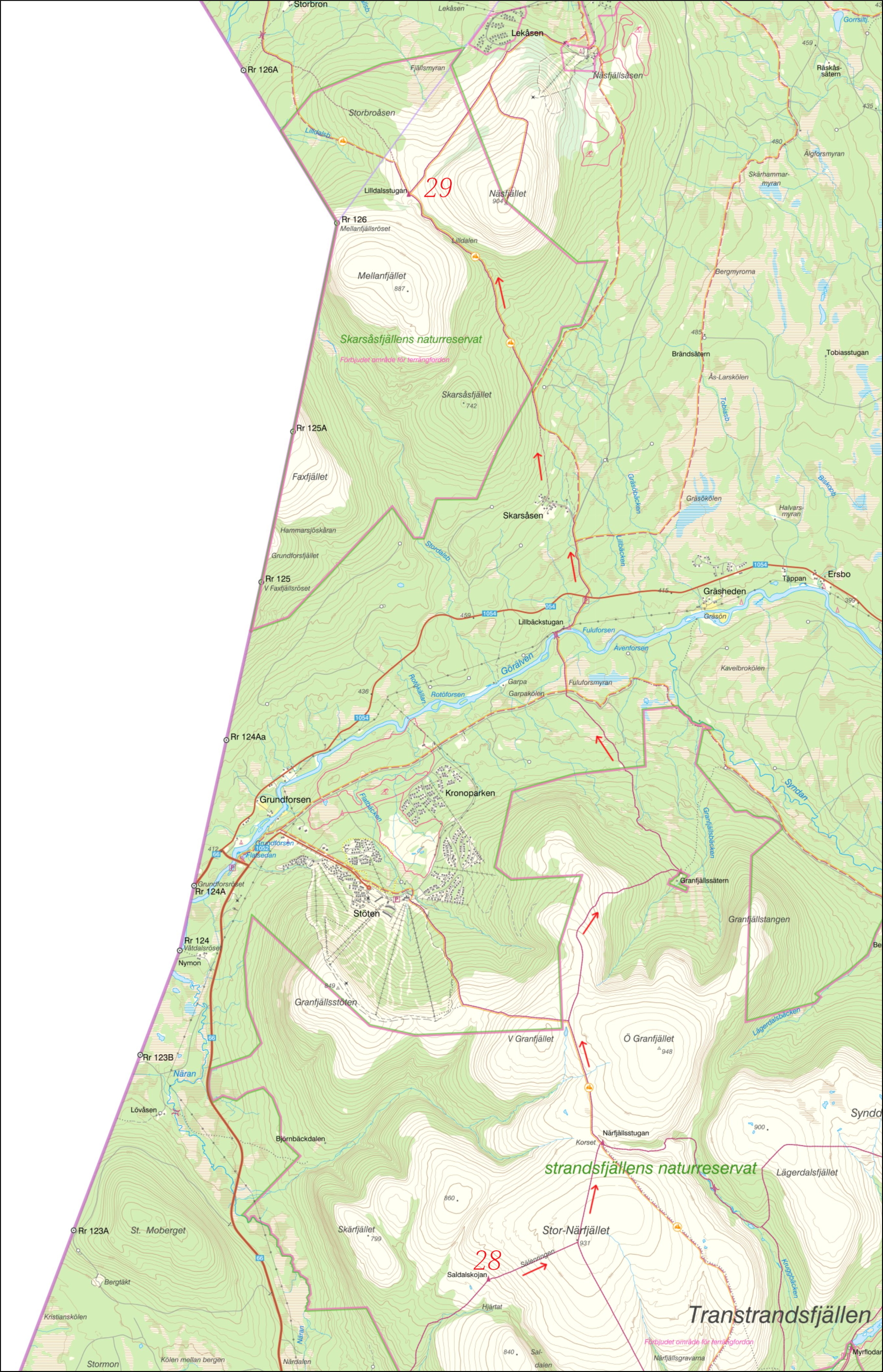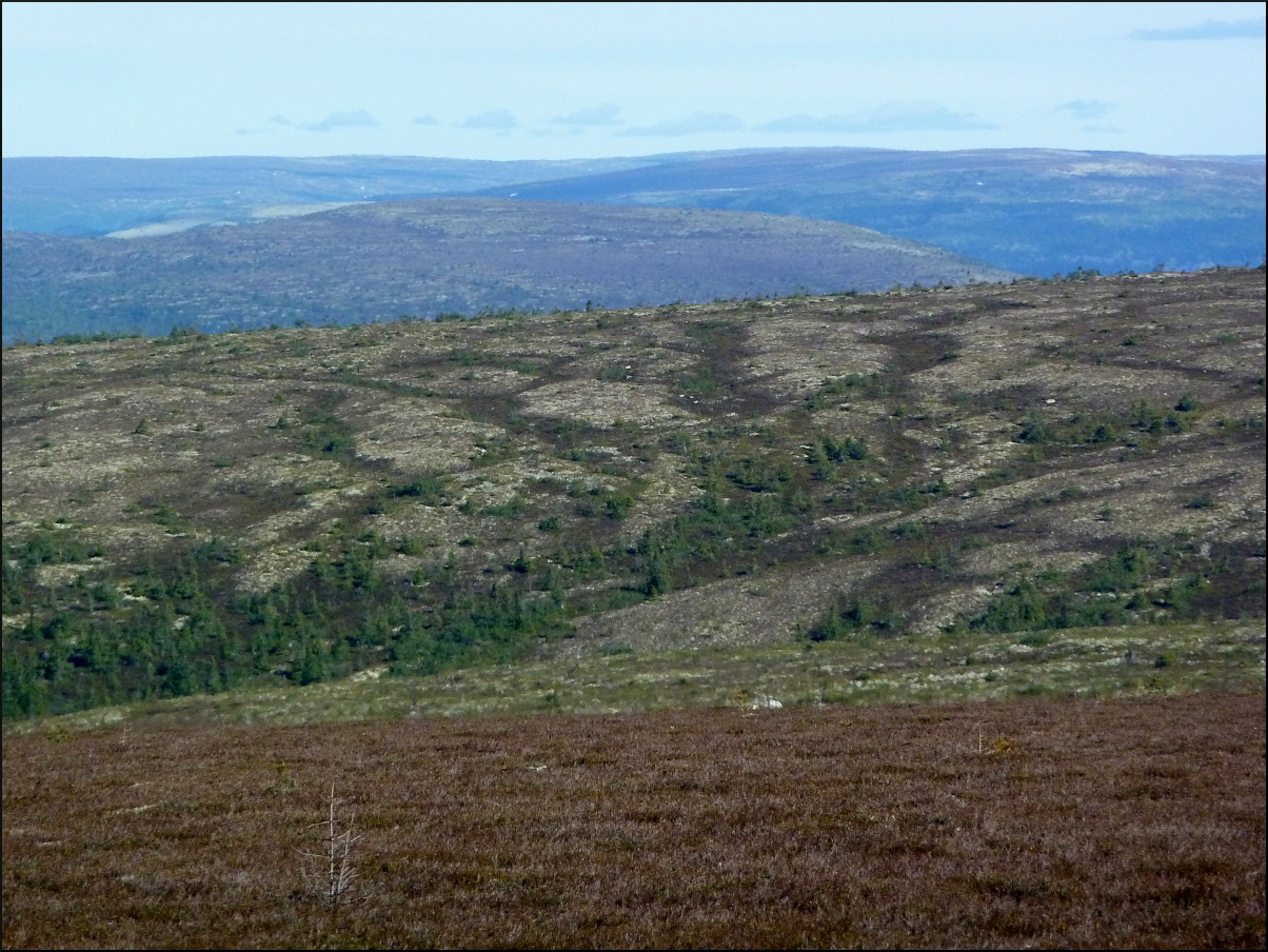 ”Axlarna och ena hälen skavde något när jag började streta i värmen de första två kilometrarna på landsväg till husen på Skarsåsen. Ett litet öppet rastställe fanns vid gränsen till Skarsåsfjällens naturreservat, med en fin utsikt. Stigen upp till Lilldalen blev seg, gick bättre utan stavar och ingen höftkänning. Hade dock gårdagens slit i färskt minne. Gick långsamt och räknade ledmarkeringar, ca 25 st per km. Först nr 1 till 13 sedan baklänges till 1 igen. Det fungerade rent mentalt.”