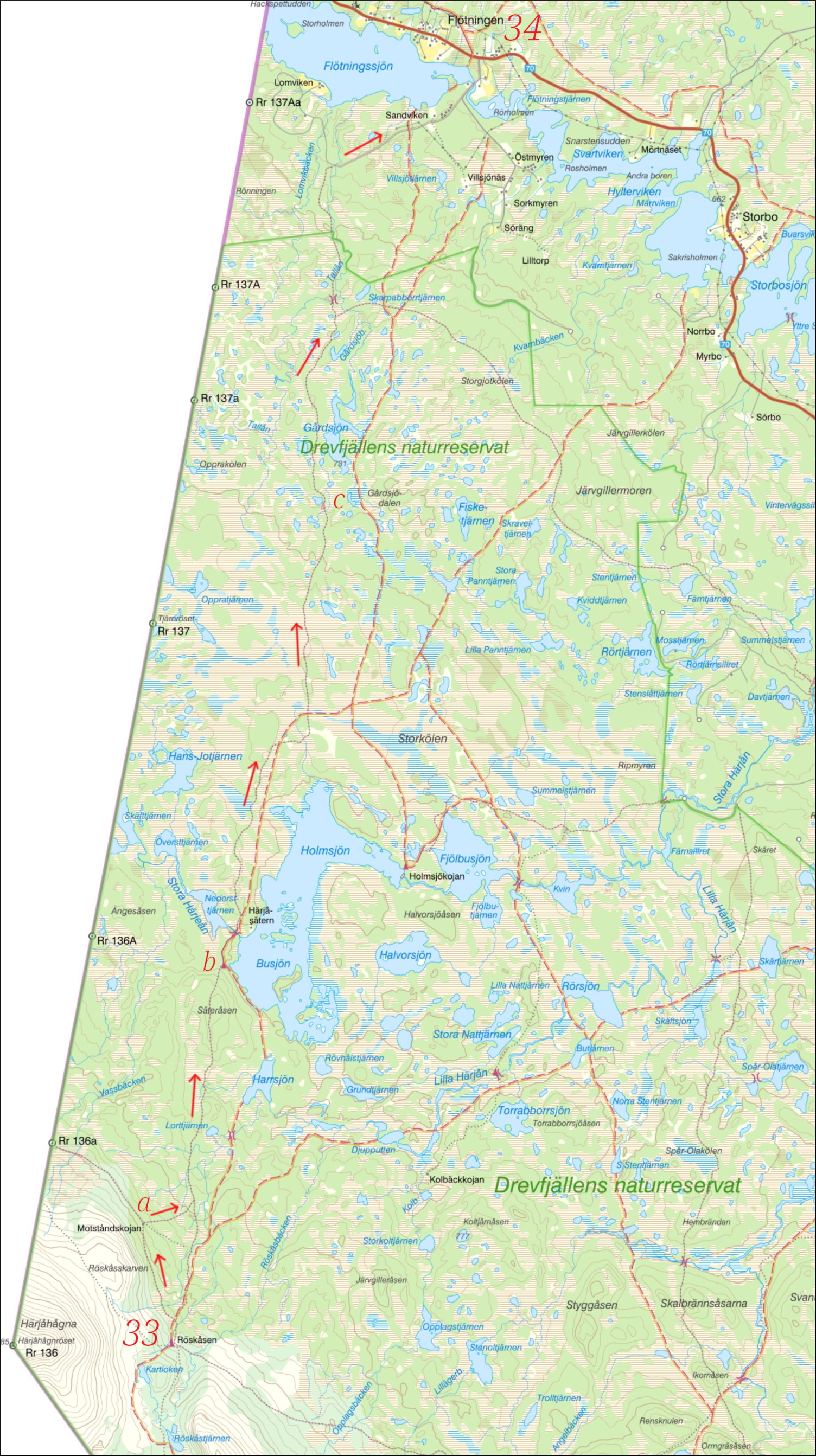 ”Resten av leden ner till Flötningen blev en transportsträcka. Passerade en fin bäck mot slutet med några typiska öringhöljor. Sista kilometrarna blev tråkig landsväg, för bi en sjö med S som i storspovar och F som i ortens fotbollsplan, fast med ljunghed som underlag.”