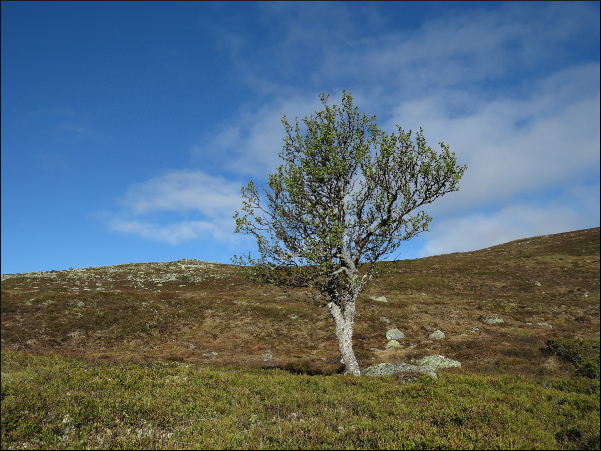 ”Seg uppförslutning över Olåsen, som gick över alltmer i blockterräng. Gick förbi ett yngre par med 30-kilos ryggsäckar vid skoterkrysset. Den närmsta kilometern var ett rent helsicke; sten, block, upp och ner. Måste hela tiden ha koll på var man satte fötterna. Antagligen därför jag missade hökugglorna som paret efter såg i björkskogen.”