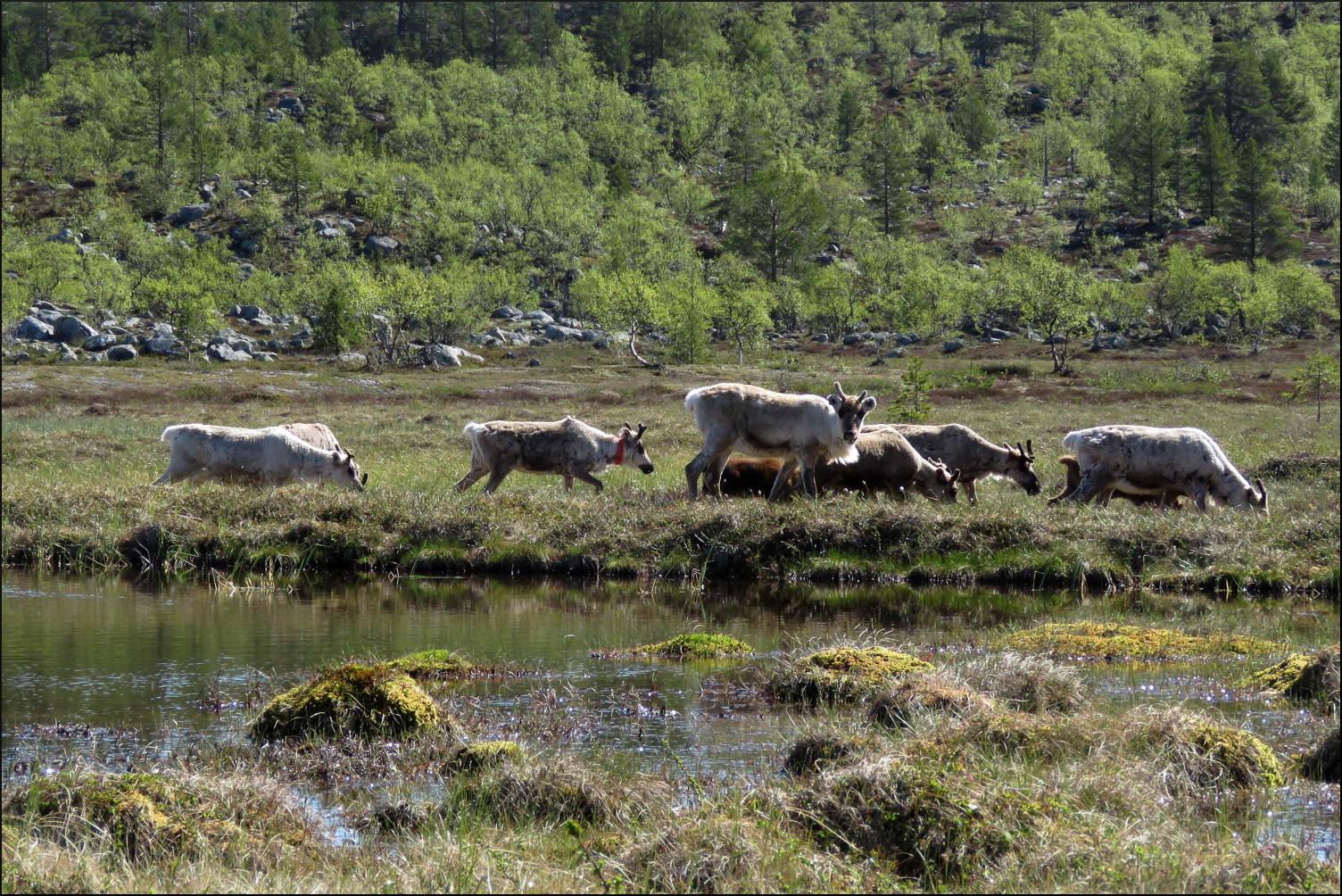 ”Paret passerade mig där jag satt vid mitt vattenhål som ett lejon i Serengeti. Plötsligt dök en liten renhjord upp längs leden norrifrån. Ingen såg mig eller gjorde notis av att jag hukade mig bakom kameran som gick varm. En till grupp anslöt sig och till slut var det 25 djur, varav 7 kalvar, som rörde sig runt mig på tre sidor längs myren.”