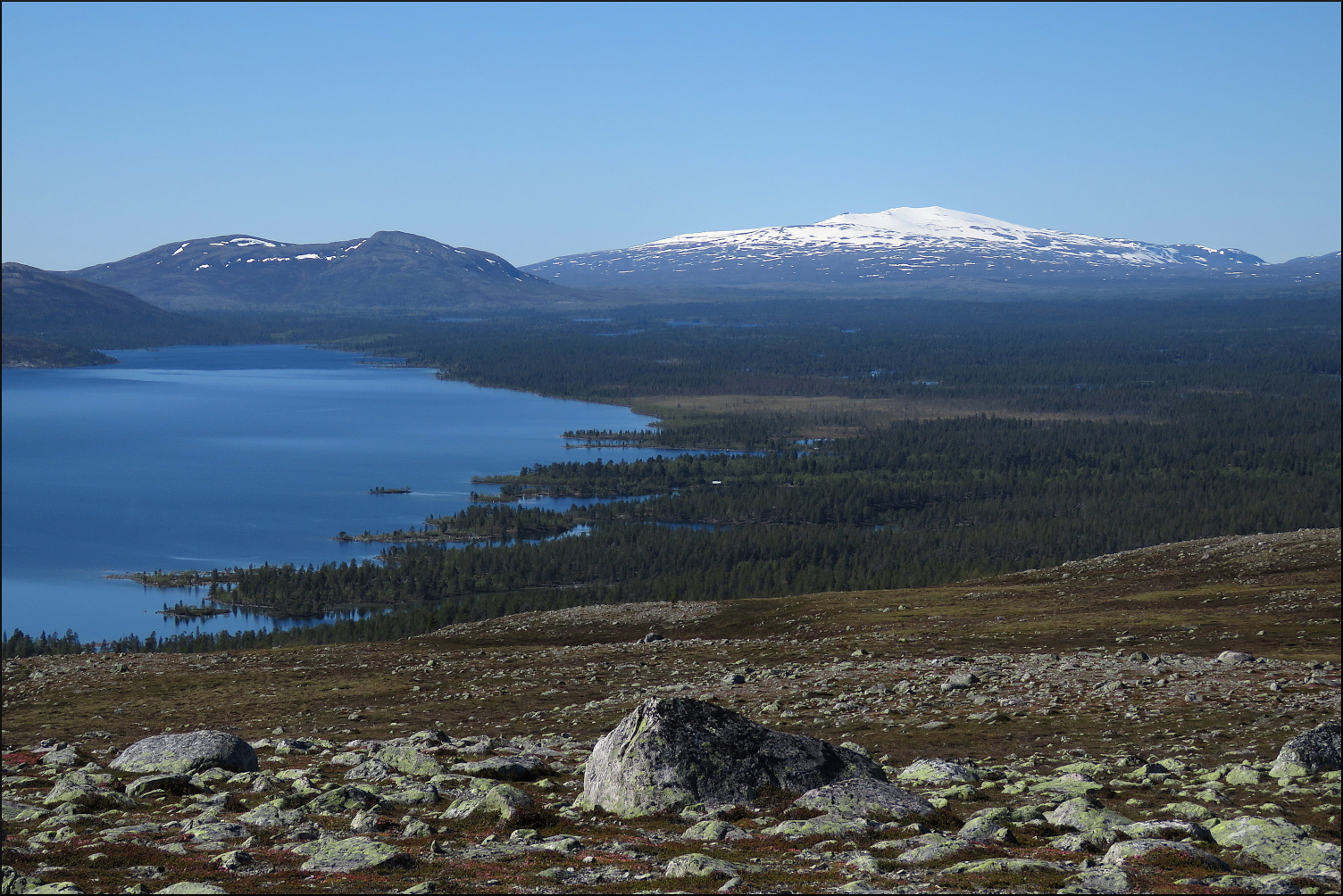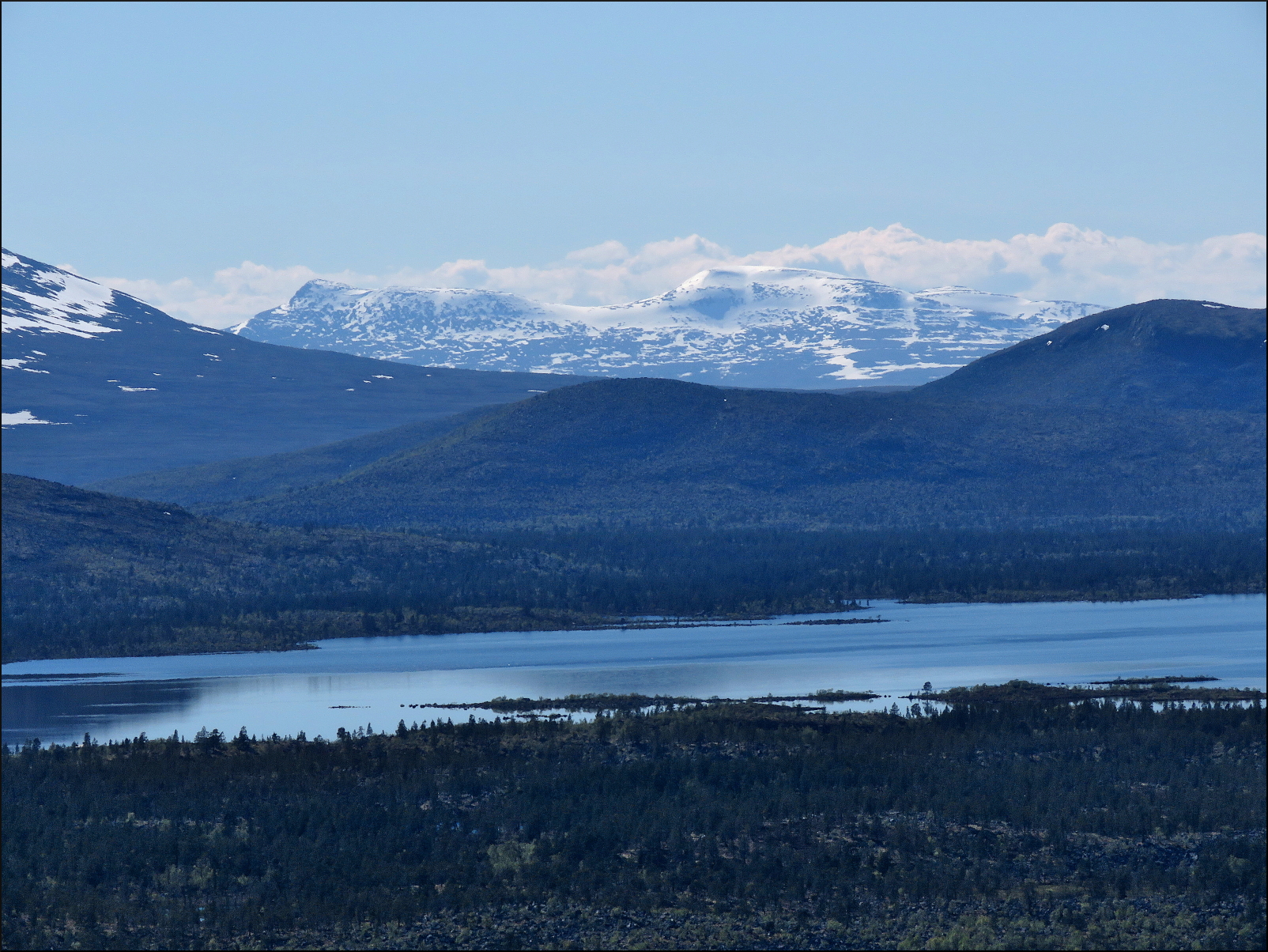 ”Toppen låg lite vid sidan av leden, flack så man fick gå runt den lite för att få hela panoramakänslan. Käkade, torka fötter (fast kängorna i stort sett var torra), plåta vyer och fjäll. Strax efter kom, det idag pigga unga paret. Skrev av mig och njöt av ett småspovspar som svepte runt mig och toppen ett varv. Sightseeing kanske!?”