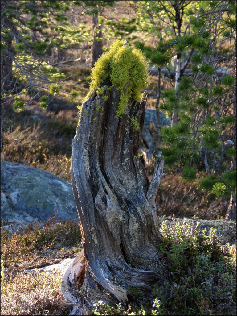 ”Fortsatte längs den fina myrbäcken, passerade en gammal bäverhydda, ner genom en park av tallurskog, småkuperad men öppen och gott om martallar. Fick några fina bilder på rödstjärtar i denna miljö.”