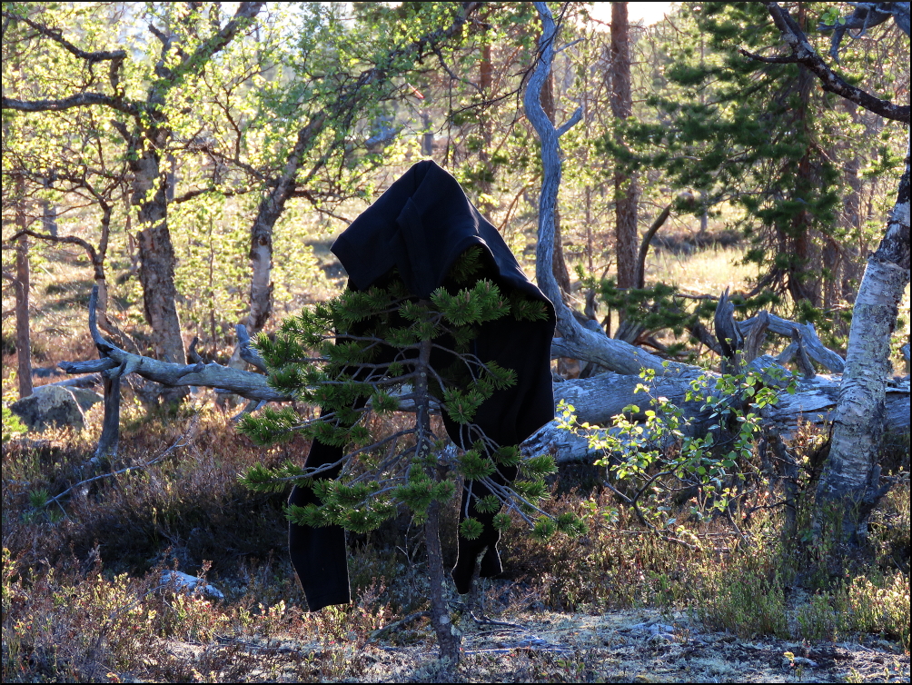 ”Hittade en fin tältplats på en udde vid utloppet (39). Lite bris från sjön i alla fall. Riggade krigsmundering, det vill säga kortärmat, över det Goretex-jacka och sen myggolja runt hela huvudet. Både jag och myggen blev lite påverkade tror jag.”