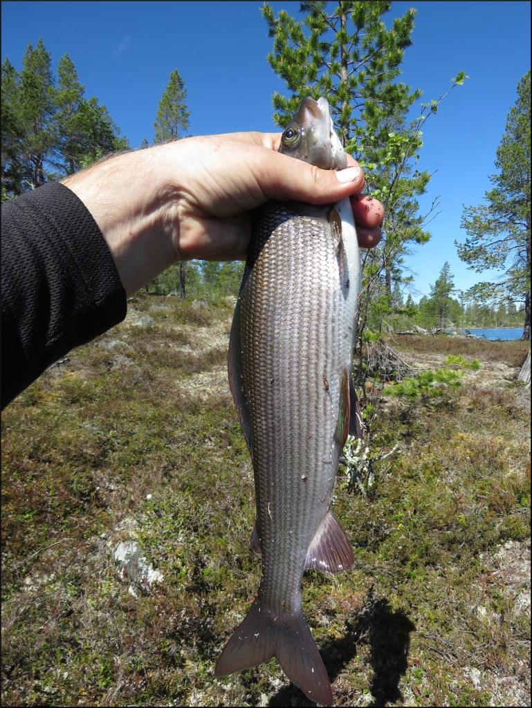 ”Vak hördes och syntes närmare ön (a), tyvärr mestadels långt ut och speciellt när det mojnade av. Den nordliga vinden tryckte vatten mellan sundet till ön för att helt plötsligt vrida till sydlig. Jag satsade på en smårostig silver Sölvkrok. Nästan mitt i sundet satt en fin harr i mothugget, sedan var det heldött, trots vak och försök med alla sorters drag. Blev istället stekt harrfilé på rågbröd och sjövatten. En lunch som heter duga!”