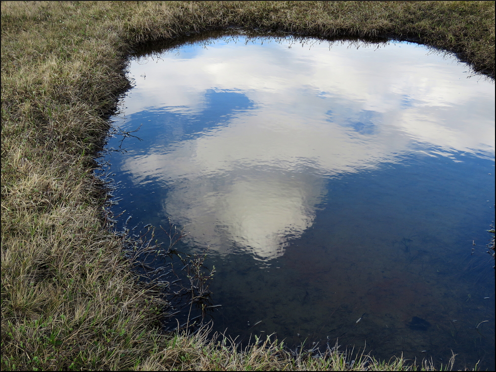 ”Påbörjade uppstigningen öster om sjön, men först dricka paus vid en av många bäckar, medan svetttröjan torkade i solen. I väster började en del ulliga moln synas när jag fortsatte uppför. Nästa etapp blev seg uppför. Höll rätt högt i mestadels småkuperad, stenig terräng, mycket upp och ner. Fjällripa och ringtrast var nya arter på högfjället.”