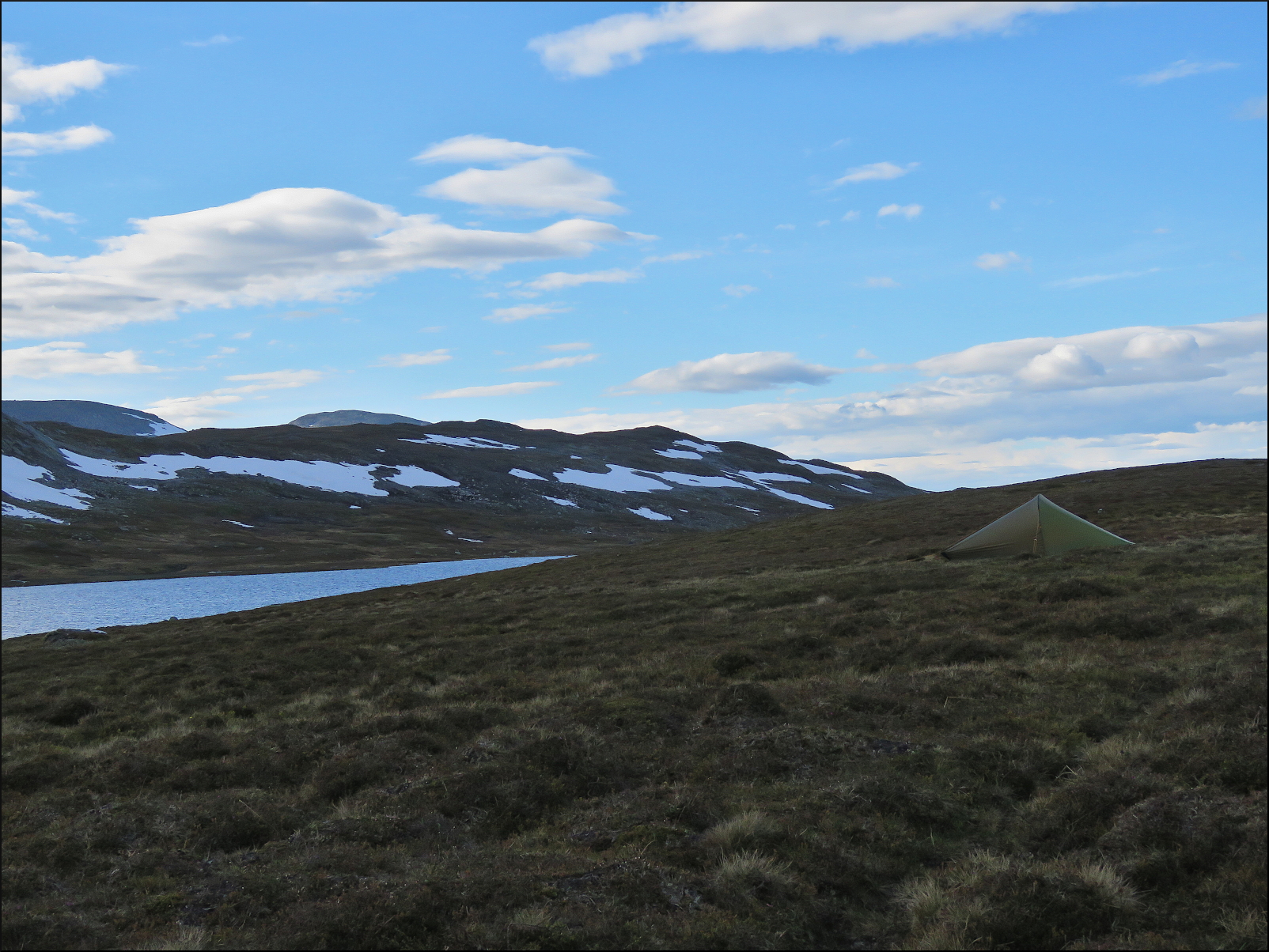 ”Sov dåligt i natt, vände och vred på mig hela tiden. Antagligen kvällskaffet eller dalripornas knorrande. Kl 6 var jag tvungen att gå upp, för varmt i tältet. Tittade ut och skådade en klarblå himmel, vindstilla och ingen mygg. Ut med kängorna för att sista försök att torka dom. Ingen brådska därför med frukost och morgonbestyr.”