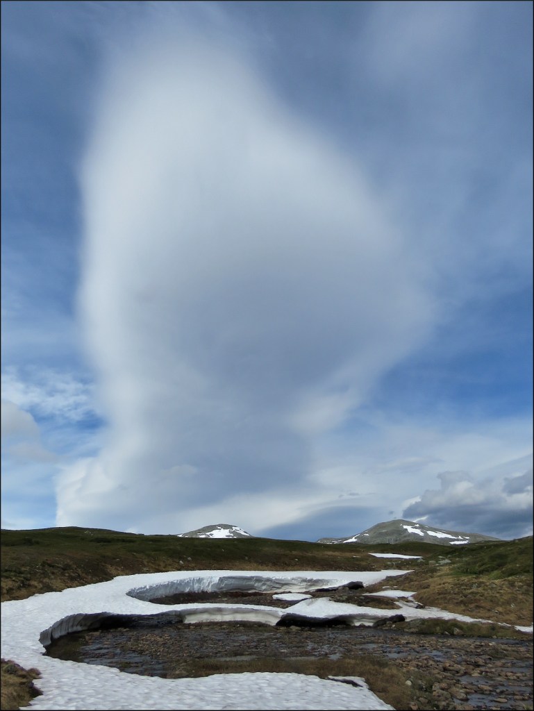 ”Rekade en tältplats, 50 meter från ett bo av en ängspiplärka. Hade precis fått upp tältet och in med grejerna, när första regnstänket kom. Bytte om och vilade lite med sovsäckstäcke. Konstaterade att klockan redan var sex, en lång seg dag! Sov, åt lite Carbonara a´ la´ Skinnarmo. Skrev dagboken samtidigt som regnskurarna kom tätar och blev längre för var gång. Skrev SMS till Mette att jag bryter i Storlien pga förkylningen. Bara tre dagar kvar av årets fjälltur alltså, tråkigt! Men som det regnar nu vid 21-snåret och tältet fullt med svettblöta kläder kan man börja undra om det här med gubbe i tält!”