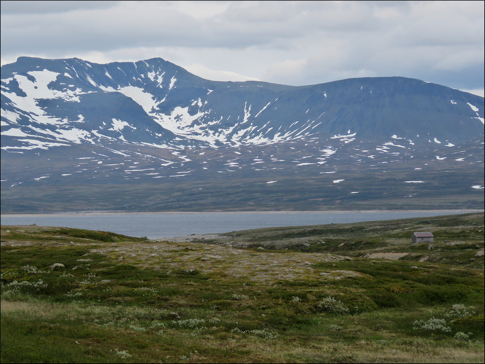 ”Precis när jag passerade stugan efter vadet kom första regnet. Bytte om i lä av det ena huset (ingen hemma), men avvaktade när jag stack näsan runt husknuten. Några regnskurar förföljde mig bort till dammen i änden av Sylsjön. Fanns både rösad led av det sämre slaget, eller fyrhjulingsspår att följa. Följde kartan som visade på vägen nedanför dammen. Fel beslut! Vägen slutade vid en stationsbyggnad. Sedan fick jag klättra på berget och bryta mig igenom ett renstängsel på toppen, vilket fler hade gjort före mig. Väl uppe visade pilar att man skulle gå på själva dammen!”