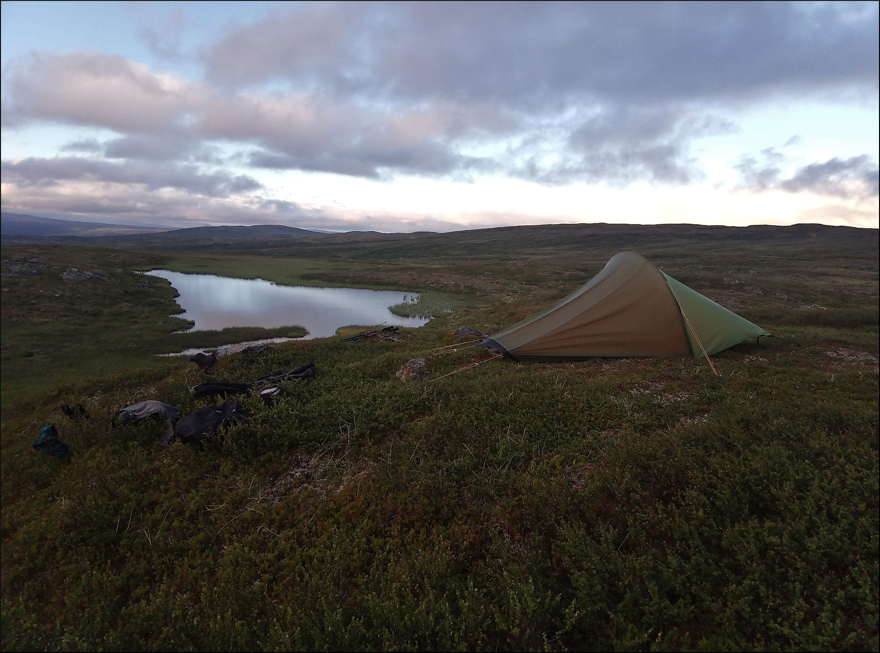 ”Dagens etapp är något längre än gårdagens mil, mätte upp ca 13 km på kartan innan avfärd. Men med tanke på dålig sikt (ca 200 m) blir det ingen upplevelse alls. Låg kvar i tältet och lyssnade till ripan, ljungpiparna och rödbenorna. Strax efter 10 lättade dimman och man såg fjällen runt om. Packa ihop snabbt och började lufsa mot Hästryggtjärnarna. Kallt med NV vind, så det blev full mundering. Solen bara glimta till några sekunder, annars var himlen helt molntäckt, men bra sikt.”