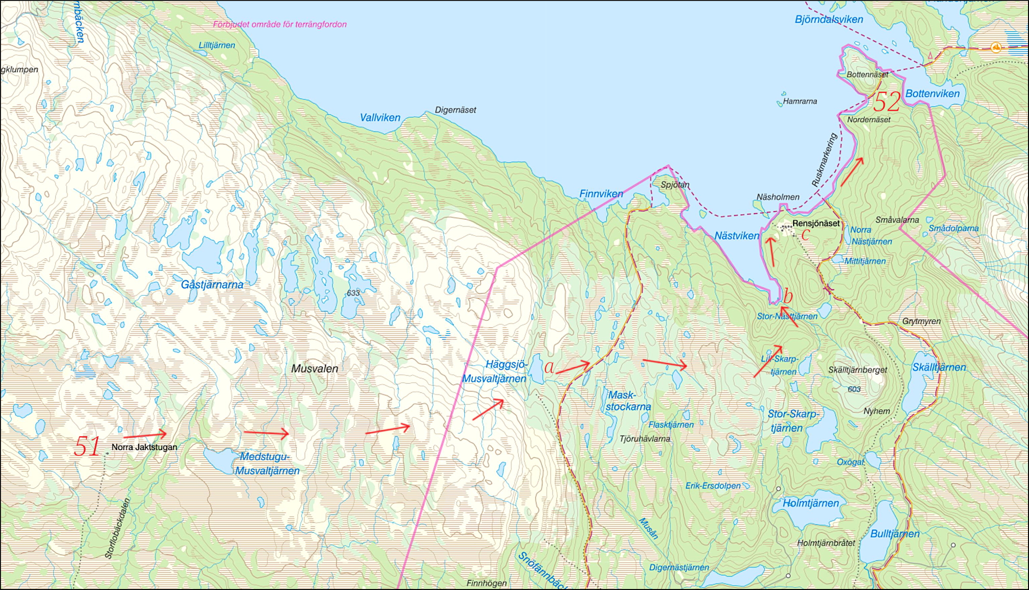 ”Jag hade siktat på stigen mot stugorna på Rensjönäset. Det blev dock tvärstopp i den täta och höga granskogen strax norr om Storskarptjärn. En 20-30 meter hög brant dök upp, omöjligt att ta sig ner. Vek av norrut mot Rensjön och kom så småningom ner. Gick på skrå i branterna, bitvis i upptrampade älgstigar, men gav till slut upp och följde en bäck. Hamnade i en makalöst fin vik med klippudde i Storrensjön (b). Nu nästan spegelblankt!”
