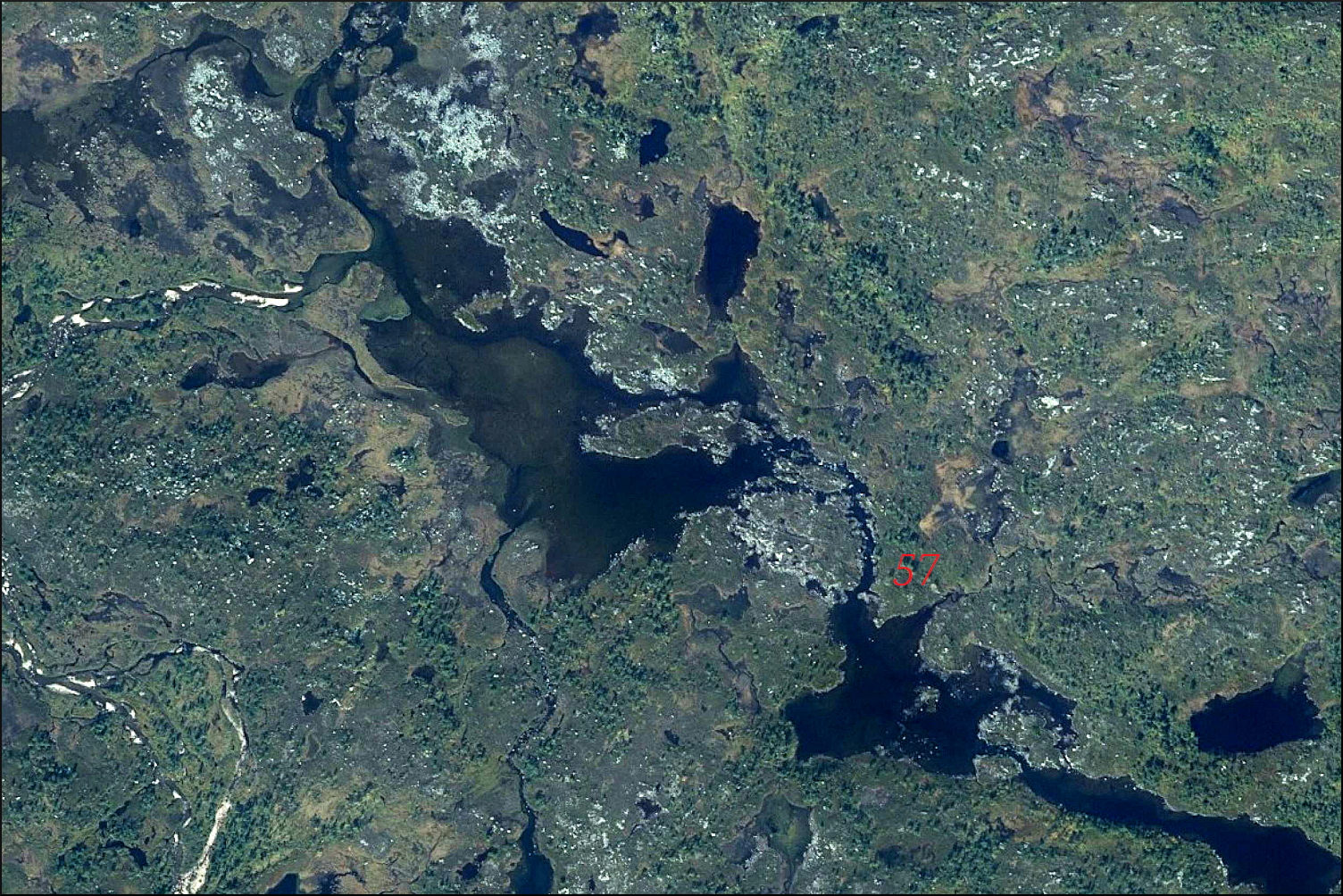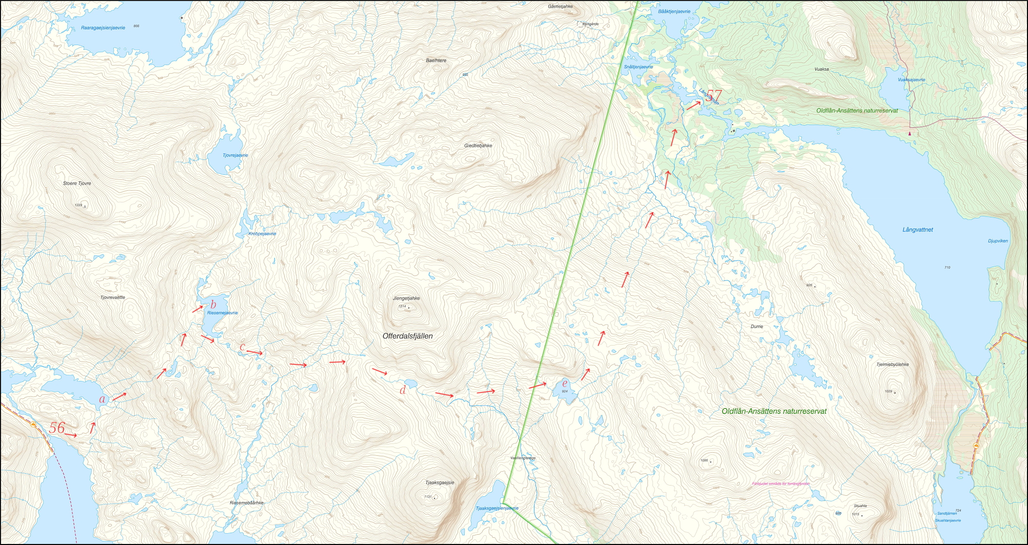 ”Gick förhållandevis snabbt upp till första namnlösa km-långa sjön, en avknoppad del av ett större sjösystem i väster. Östra sidan av sjön var grund där jag passerade och inga vak syntes. Sedan följde en tuff stigning upp till ett pass på 1000 meters höjd. Hyfsad terräng, även om det var mycket sten, dock ännu värre med blockterräng mot nästa sjö, Riesemejaevrie (b).”