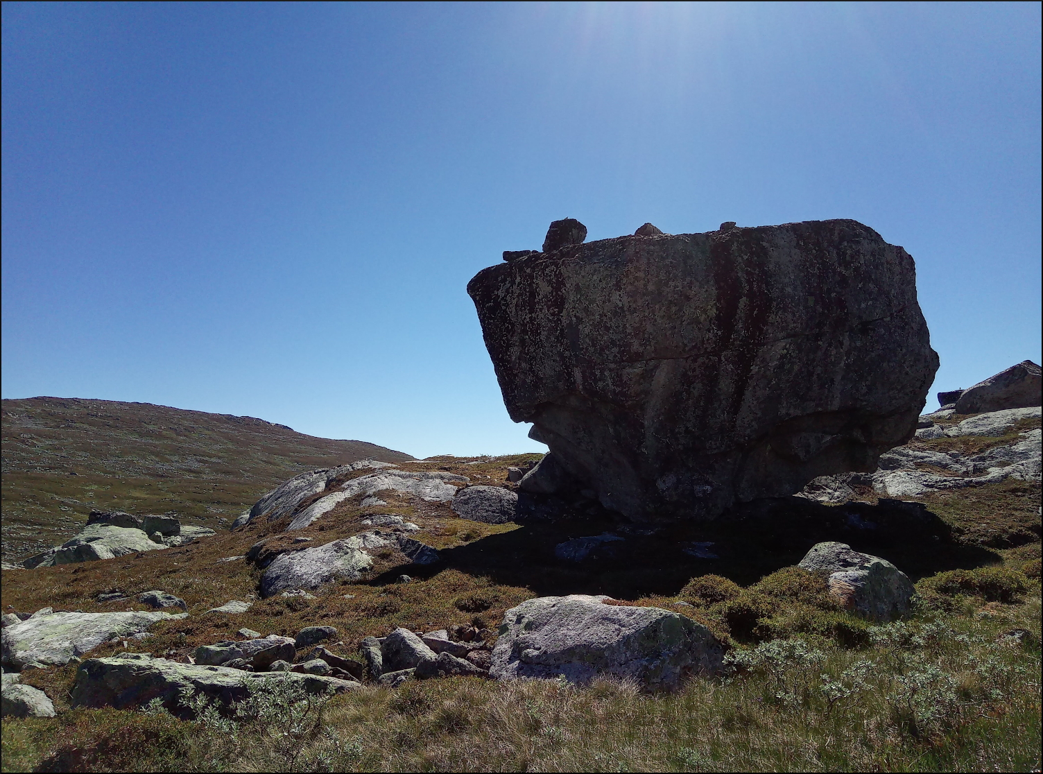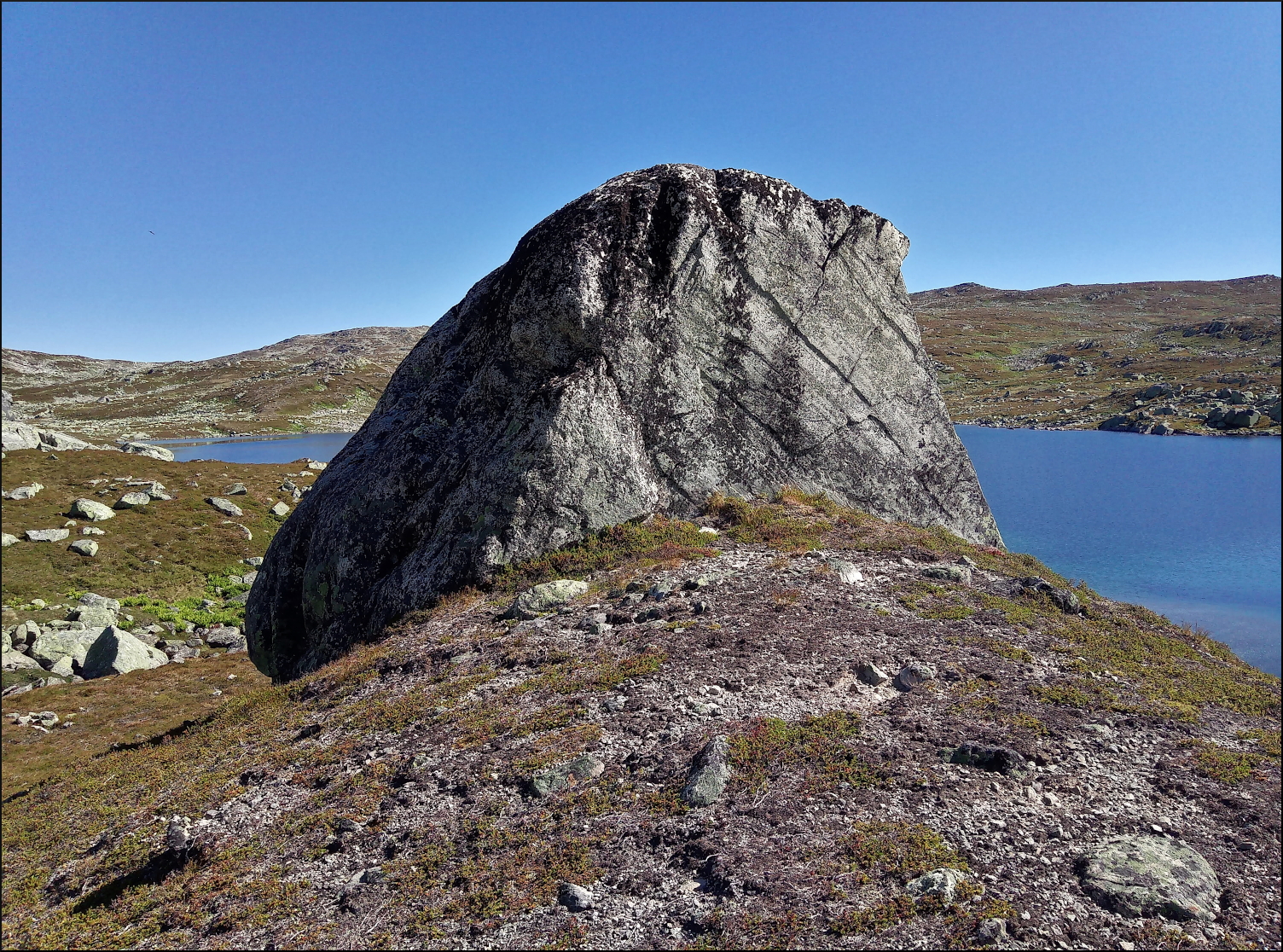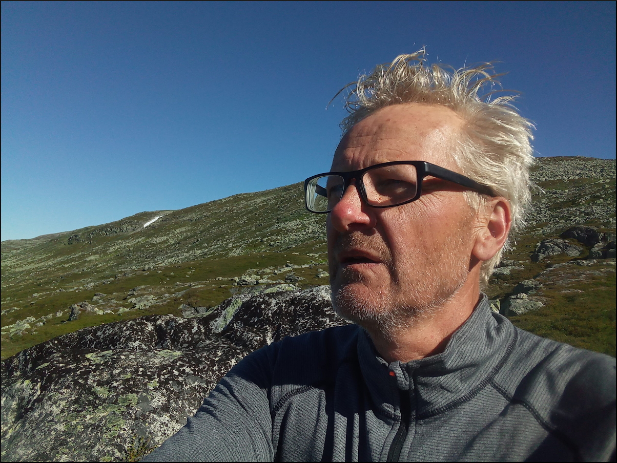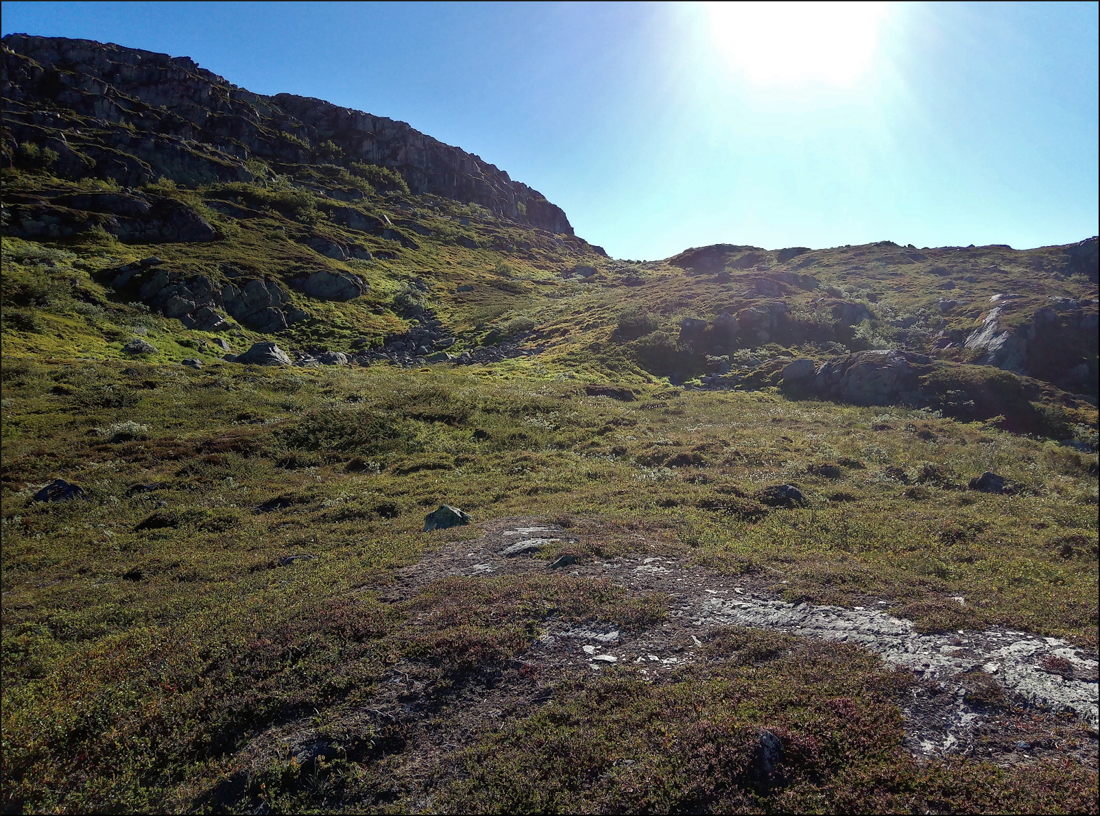 ”Kom iväg strax efter åtta och siktade på ett litet pass under branten ovanför min tältplats. Gick hyfsat även om svetten bara forsade i den plötsliga värmen. Natten hade däremot varit lite kylig ett tag, frös om händerna som hamnat utanför säcken. En myggsvärm uppvaktade mig hela tiden, smög mig i ryggen så att säga. Så fortsatte det hela dagen, förutom när någon enstaka vindpust kom. Fick ta till desperata knep och smörja in axlarna på utsidan av tröjan, som stramade när ryggsäcken var på.”