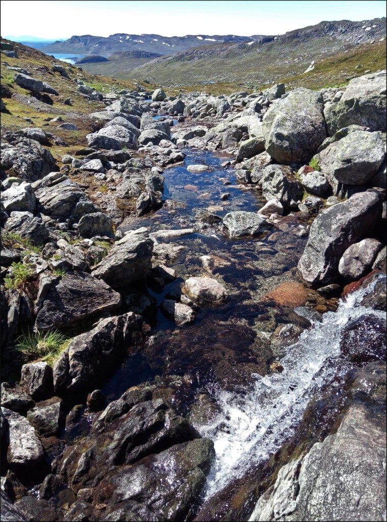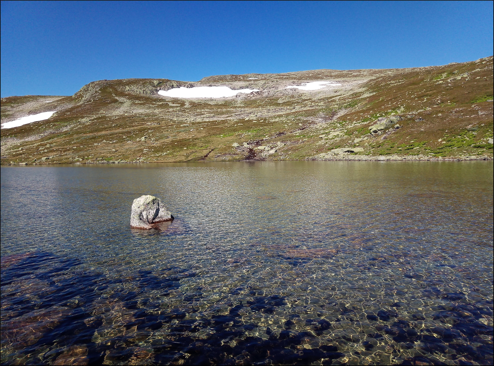 ”Nedstigning i hettan till nästa större sjö. Bitvis mycket sten och en del snölegor kvar på norra sidan där jag gick. Blockterräng under branten och djupt längs kanten, så testa några kast vid ett bäckutlopp i sjön. Inget napp eller vak. Drack en halvliter ljummet fjällvatten, för vilken gång i ordningen under dagen har jag inte koll på. Svettas ymnigt och luften står nästan still på kalfjället.”