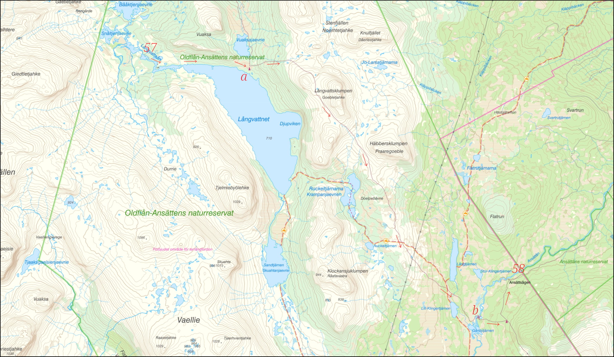 ”Inga älgar idag, bara en älgskalle i en myr. Björktrastar och gök i fjällbjörkskogarna. Jag tror att jag nästan trampade på fem stora grodor idag, dessutom grodyngel i kaffegölen på fjället. Stigen var ok från trädgränsen ner till skoterleden (fyrhjulingspår), sedan sämre igen, för att bli bra från bron och neröver. Var rätt så tidigt nere vid bron över Ansättån. Dåligt dricksvatten i den nästan stillastående ån. Vakade både här och i sjön tidigare. Medan min sista middag drog (frystorkad pasta med ost och broccoli) hann jag ta fem småöringar nedströms bron på den lilla spinnaren, ingen över 20 cm. En familj storskrake med ungar i höljan var oroliga medan jag kastade.”