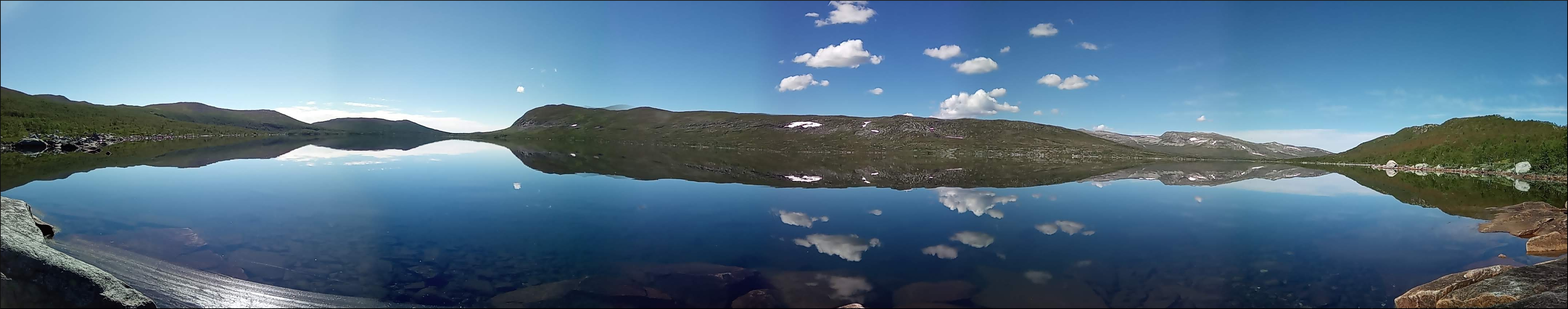 ”Det blev den hetaste dagen hittills, ingen vind och lite skugga att få på fjället Långvattsklumpen. Dessutom väldigt dåligt med drickbart vatten. Kände en panik i vissa lägen när svetten forsade av mig. Leden var förvisso markerad, ibland stolpar, men oftast rödmålade träd och stenar, några enkla rösen ibland. Var det grönt och tät vegetation, myr eller fuktig mark, fanns ingen stig alls. Likaså på fjället, mer renstigar än upptrampad led. Det blev mycket fokus på att hitta och få i sig vatten. Tog survatten ur en göl och kokade mycket sötsoppa samt kaffe. Vattnet från sjön dryga jag ut lite och tömde det sista av druvsockret i flaskan. Paus varje halvtimme för att dricka och få skugga på vägen ner sen.”