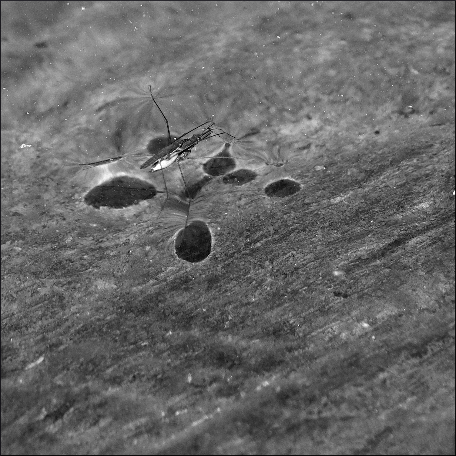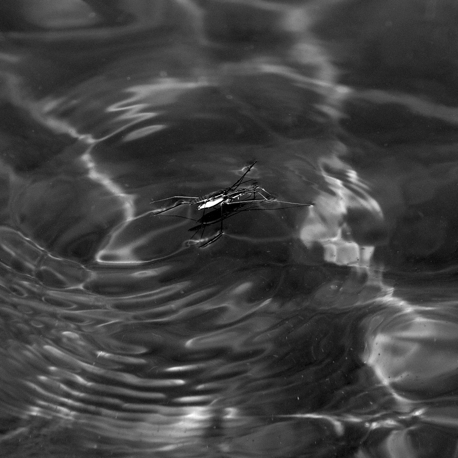Sommarblankt vatten och mysteriet med dess ytspänning, trots två lager skräddare med smala ben.