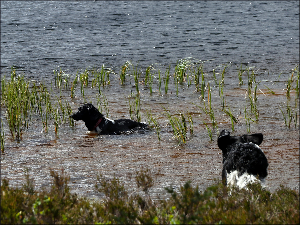 Skönt för hundarna med svalkande bad. Är det en timmerstuga på översta bilden, moderniserad med ett plåttak? Fin bild på de späda ormbunkarna och på frugan med hundarna. Ibland får man ha förstånd att ge upp.