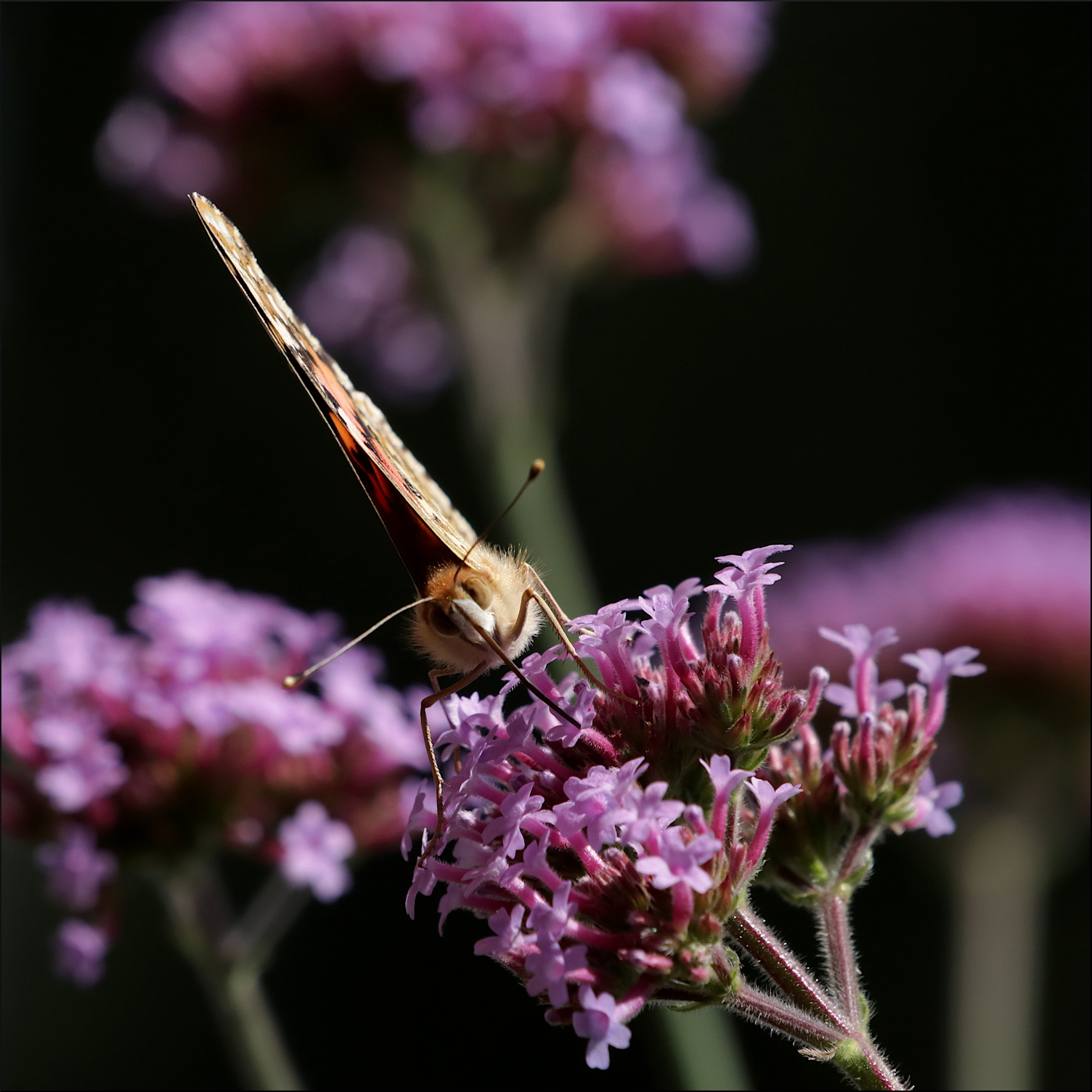 Trots torkan, eller kanske tack vare, så har det varit ovanligt många fjärilar i trädgården. Jag hade lånat ut mitt Tamron telezoom 150-600 mm till en ung kille som ville testa lite fågelfoto. Fick som pant låna hans Sigma 70-200 mm istället, ett ljusstarkt och skarpt objektiv. Testa det på några fjärilar och blev mycket positivt överraskad, Med den korta närgränsen och full zoom, fungerade det lika bra som ett makro, och fjärilarna höll sig lugnare.