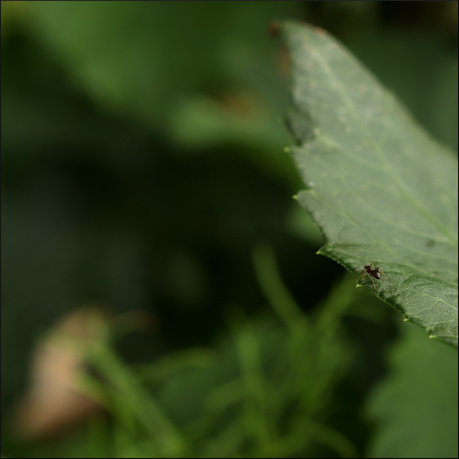1. Små kryp på spännande stigar, ibland farligt nära kanten. Det dekorativa röda bladet med väl synliga bladnerver gör sig bra på bild.